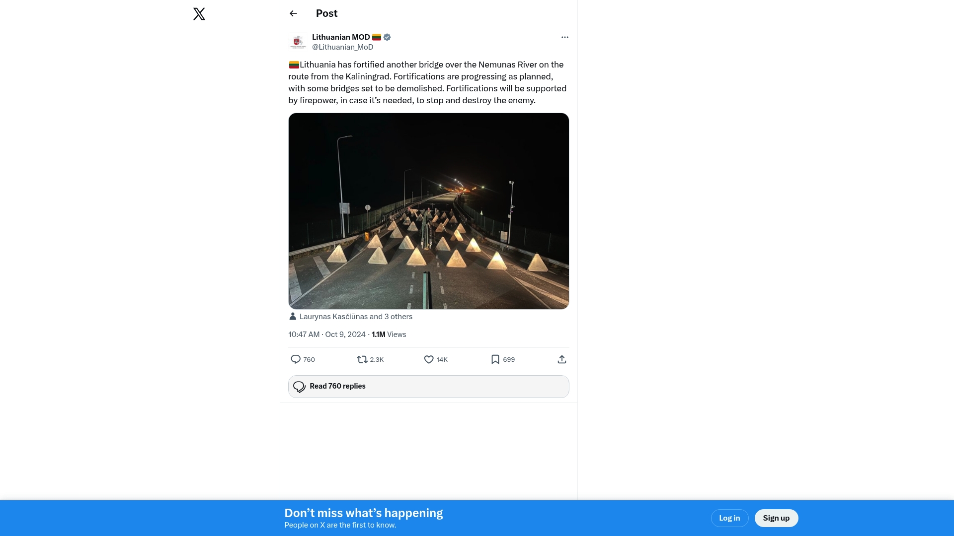 The Lithuanian Ministry of Defence announced that Lithuania has fortified another bridge over the Nemunas River on the route from Kaliningrad. Fortifications are progressing as planned, with some bridges set to be demolished and fortifications to be supported by firepower if needed, to stop and destroy the enemy.