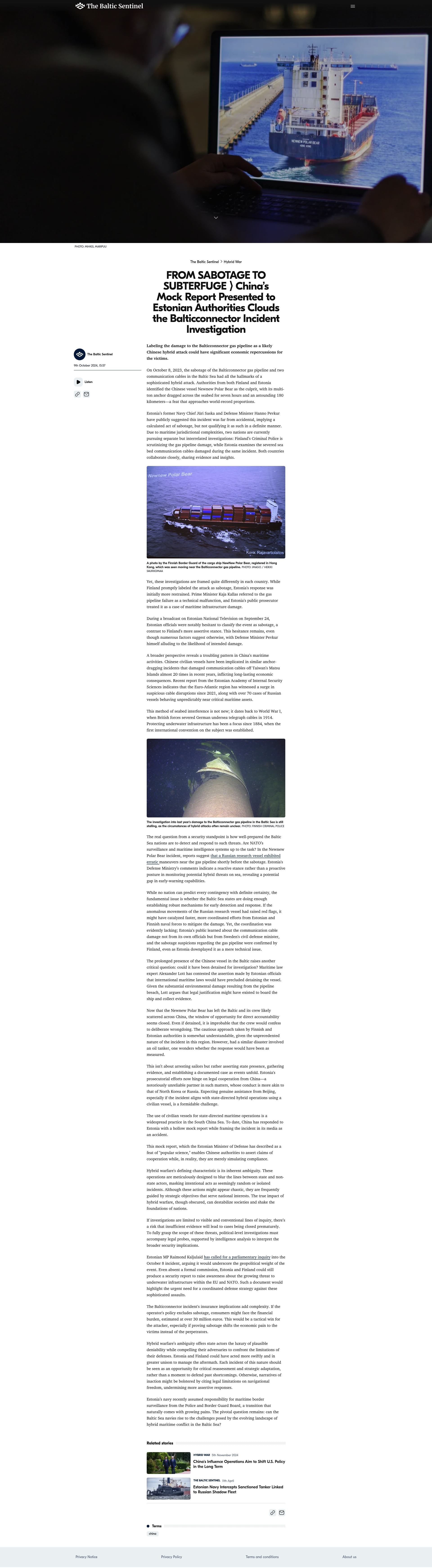 Headline: FROM SABOTAGE TO SUBTERFUGE ⟩ China’s Mock Report Presented to Estonian Authorities Clouds the Balticconnector Incident Investigation