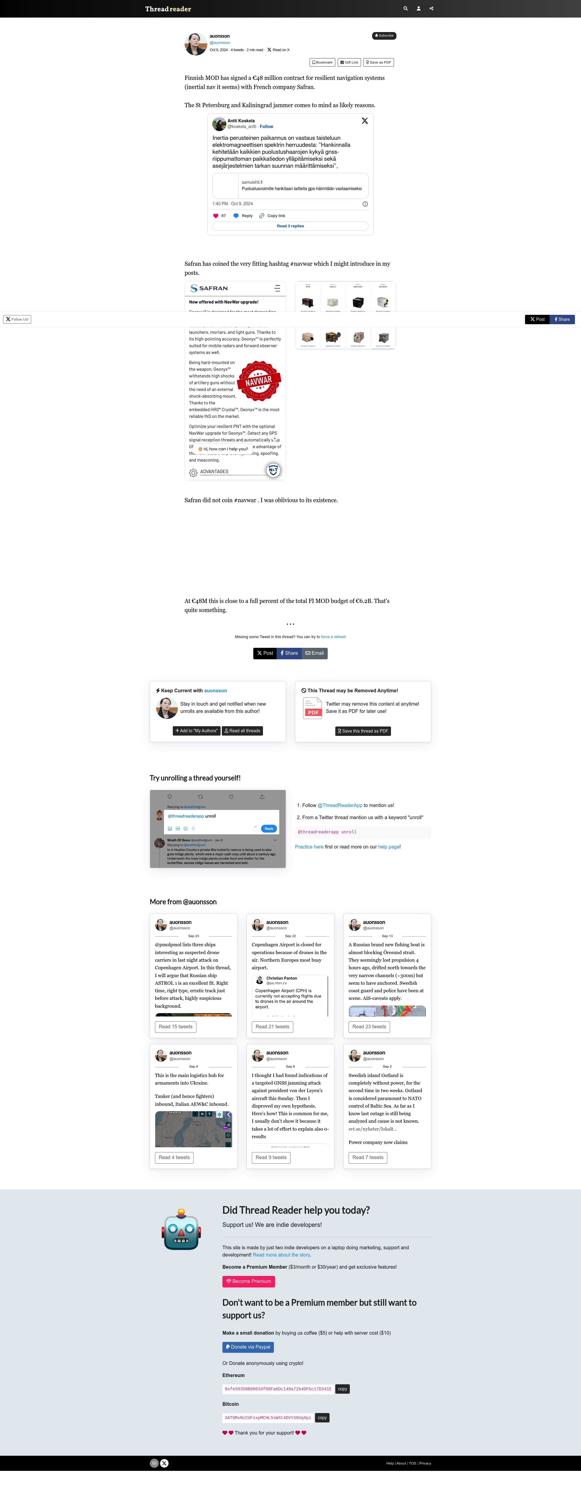- "Finnish MOD has signed a €4.8 million contract for resilient navigation systems (inertial but it seems) with French company Safran."