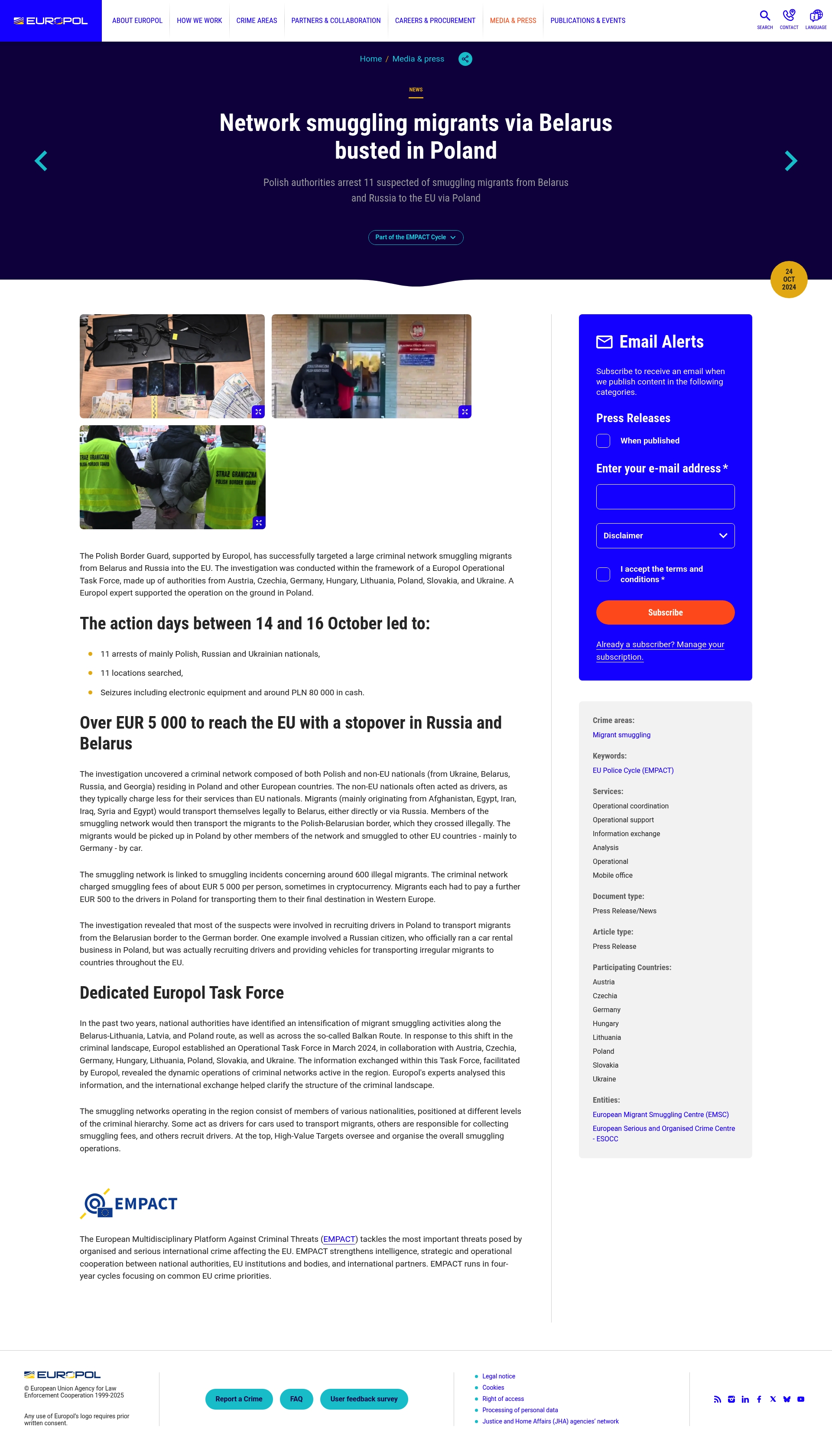 Polish authorities, supported by Europol, arrested 11 suspected members of a criminal network smuggling migrants from Belarus and Russia to the EU via Poland. The suspects include Polish, Russian, and Ukrainian nationals, with the operation involving multiple searches and seizures. The group is estimated to have smuggled around 600 migrants, primarily transporting them from the Belarusian border to Germany and other EU states.