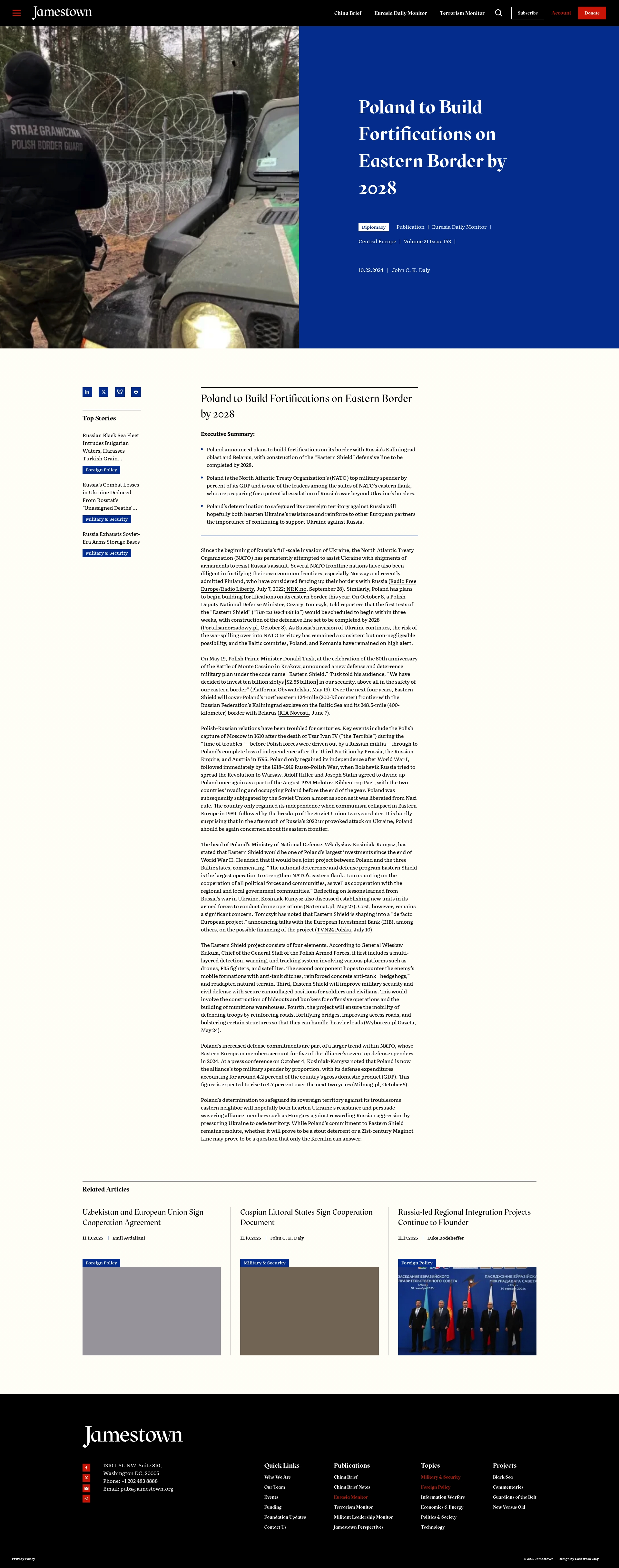 - "Poland announced plans to build fortifications on its border with Russia’s Kaliningrad oblast and Belarus, with construction of the 'Eastern Shield' defensive line to be completed by 2028."