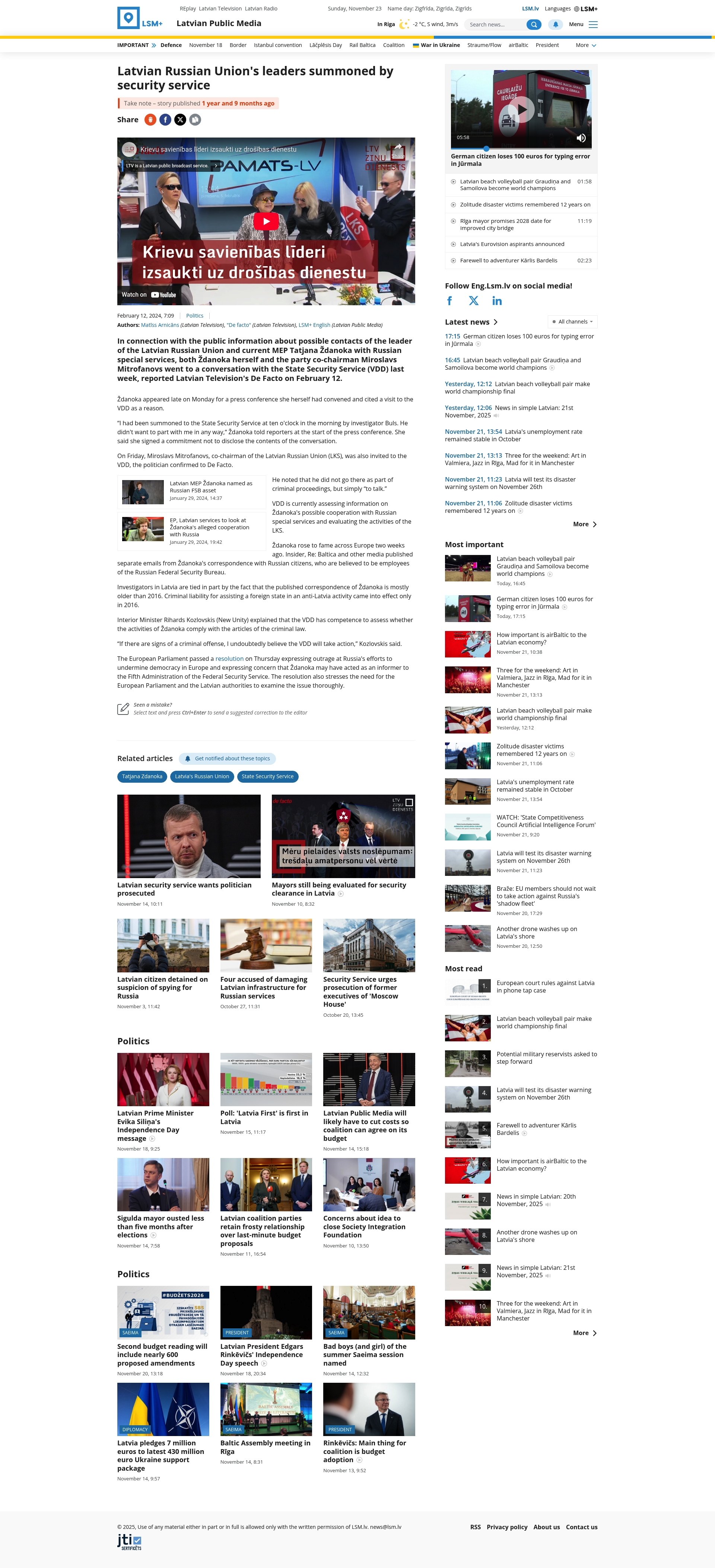 Latvian Russian Union leaders, including MEP Tatjana Ždanoka and party co-chairman Miroslavs Mitrofanovs, were summoned by the State Security Service (VDD) following public reports of Ždanoka's possible contacts with Russian special services. The authorities are currently assessing whether any criminal offense may have occurred related to under-examined ties or cooperation.