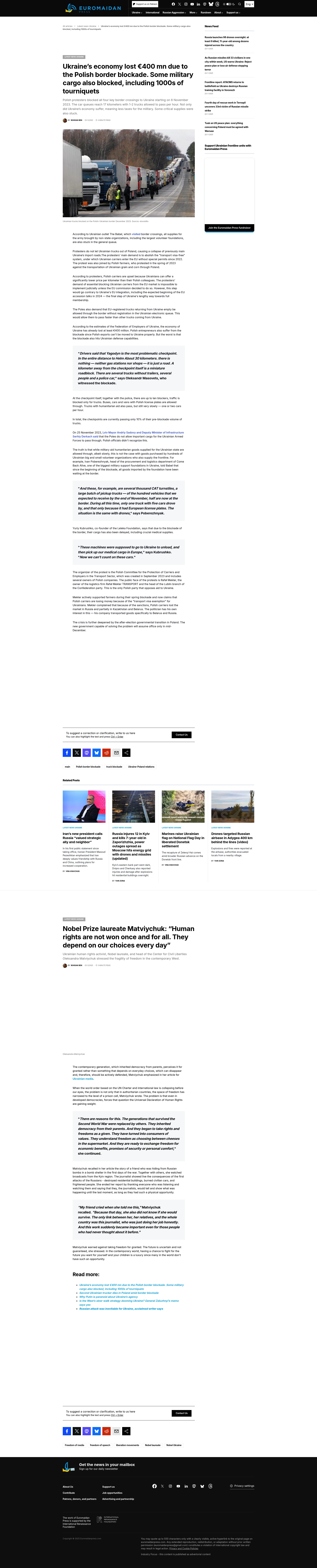 A blockade at the Polish-Ukrainian border caused by Polish truckers disrupted cross-border traffic, resulting in estimated economic losses of €400 million for Ukraine. The blockade not only affected commercial cargo but also blocked military cargo, including thousands of tourniquets intended for Ukraine's forces.
