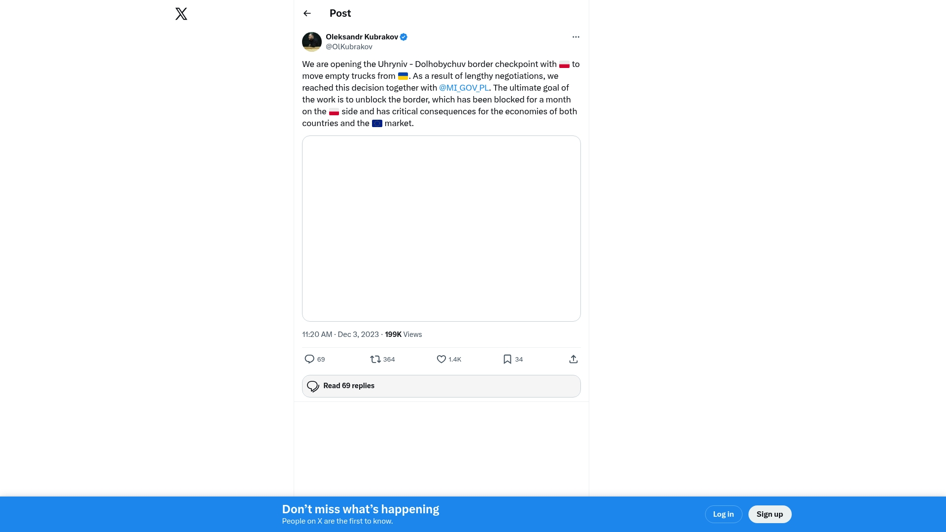 ????Polish Truck Blockade. Some Progress. We are opening the Uhryniv - Dolhobychuv border checkpoint with ?? to move empty trucks from ??. As a result of lengthy negotiations, we reached this decision together with @MI_GOV_PL. The ultimate goal of the work is to unblock the border, which has been blocked for a month on the ?? side and has critical consequences for the economies of both countries and the ?? market.
