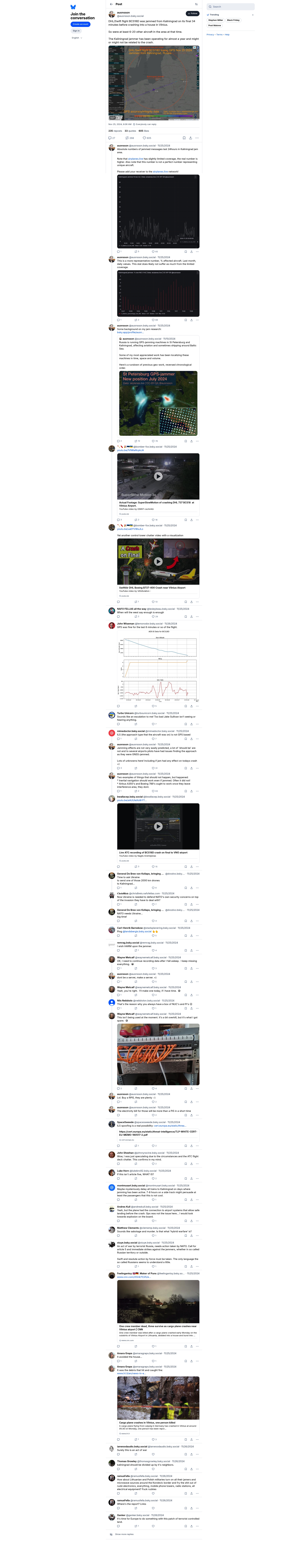 A DHL/Swift flight BCS18D was reportedly jammed by a Kaliningrad-based jammer during its final 34 minutes before it crashed into a house in Vilnius, Lithuania. The interference affected at least 6 to 20 other aircraft in the area at the same time. The jammer in Kaliningrad has been operational for nearly a year and its direct connection to the crash remains unconfirmed.
