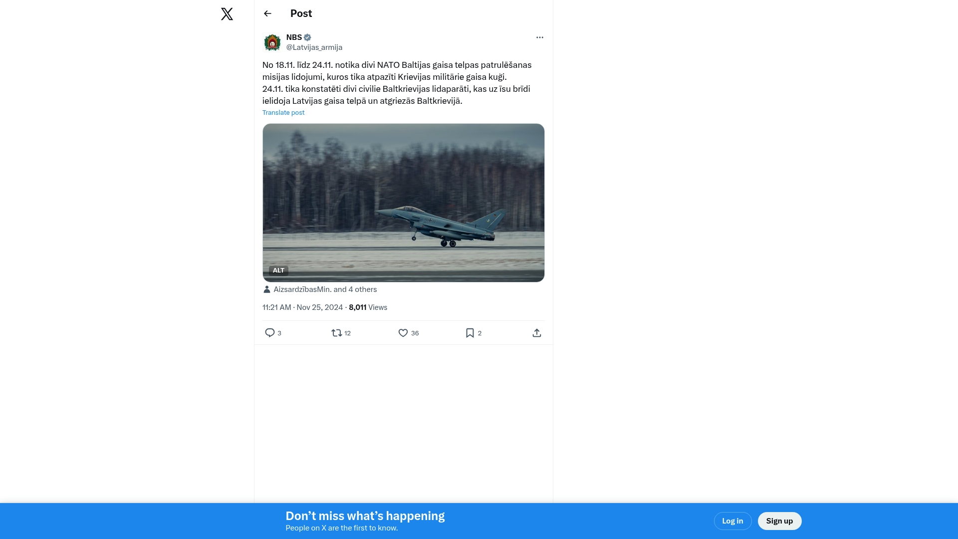 - "No 18.11. līdz 24.11. notika divi NATO Baltijas gaisa telpas patrulēšanas misijas lidojumi, kuros tika atpazīti Krievijas militārie gaisa kuģi."