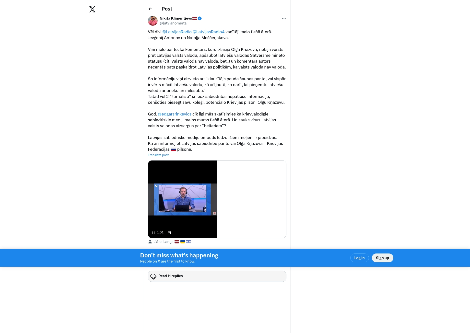 A Latvian X (Twitter) user accuses Latvian public radio (Latvijas Radio) hosts of spreading disinformation on-air regarding the official status of the Latvian language and the constitutional requirement to use it. The post alleges that comments by Olga Knazeva were misleading and not adequately corrected by the program's hosts. The author suggests this is part of a pattern involving Russian-language media personalities in Latvia and calls for action by the Latvian media ombudsman and public awareness about possible Russian Federation citizenship of the commentator.