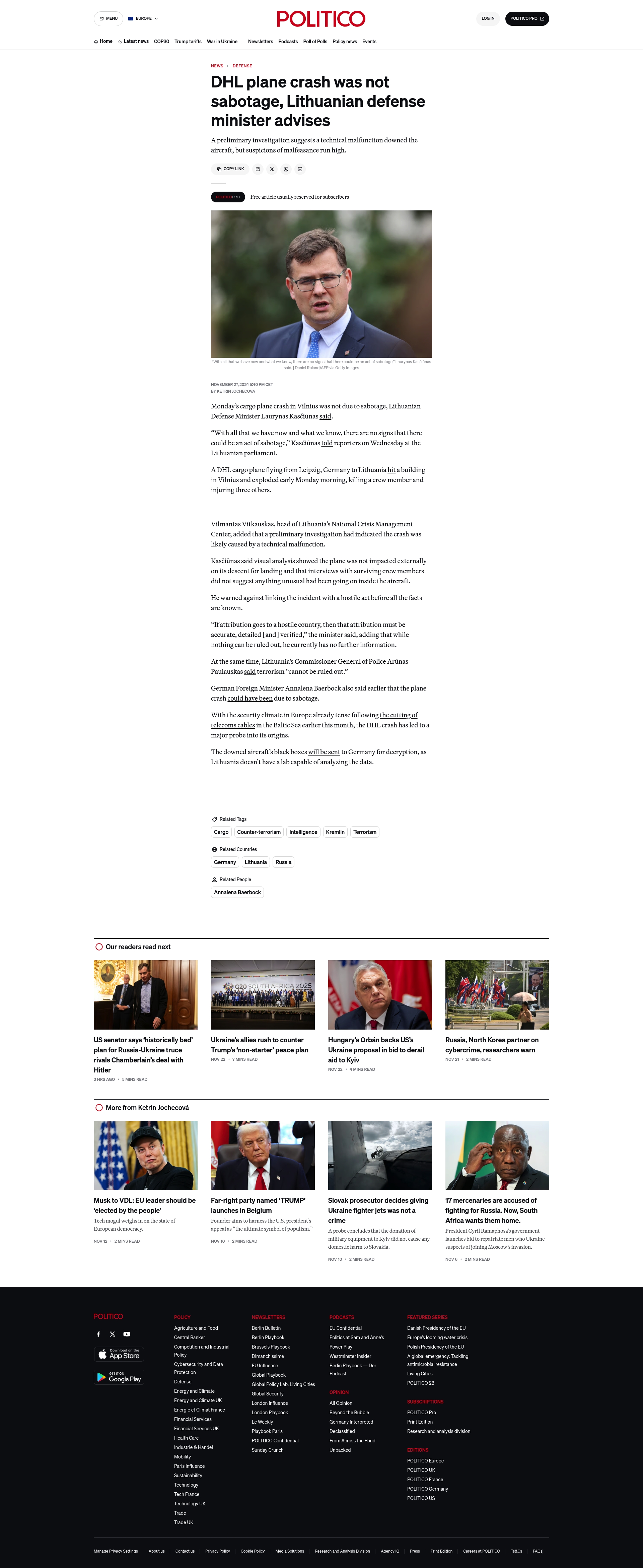 - "Monday’s cargo plane crash in Vilnius was not due to sabotage, Lithuanian Defense Minister Laurynas Kasčiūnas said."