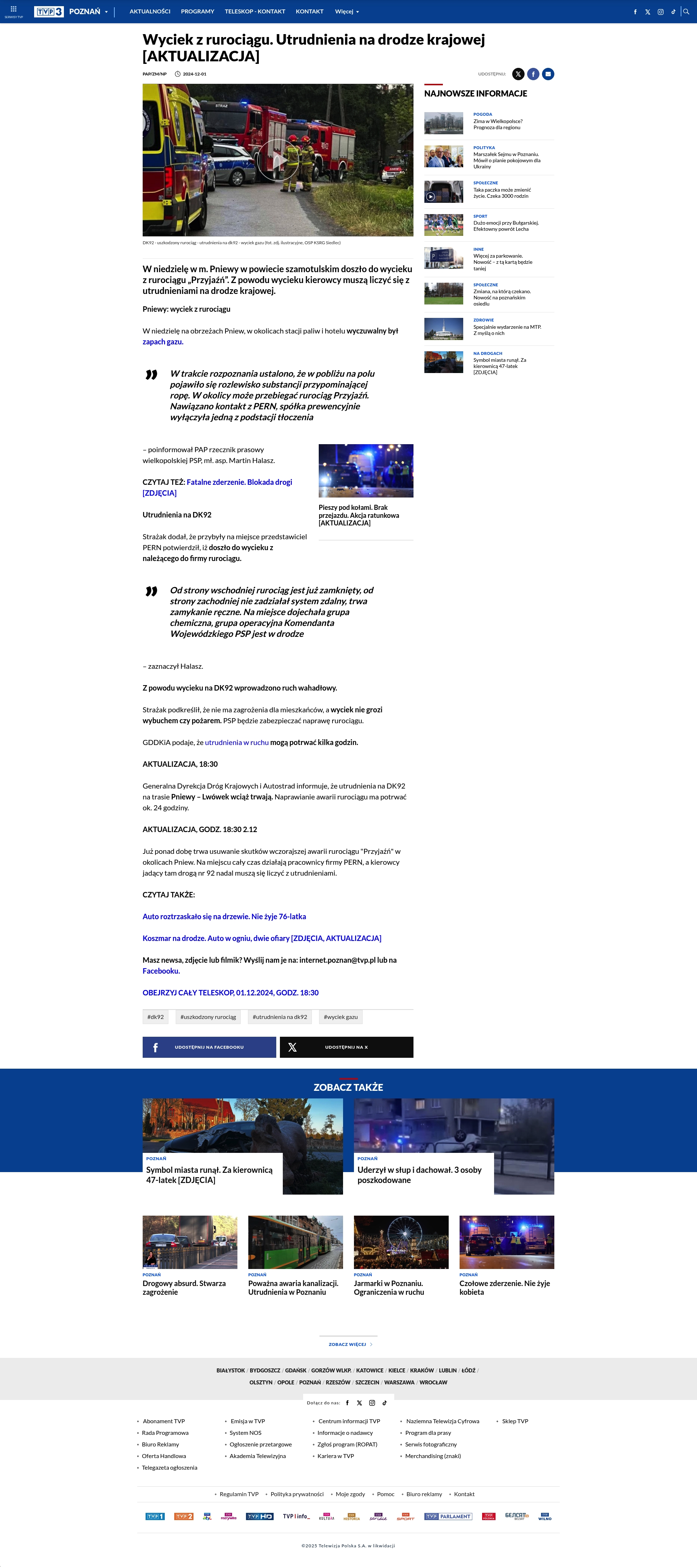 - "Utrudnienia na DK92 na trasie Pniewy – Lwówek wciąż trwają. Naprawianie awarii rurociągu ma potrwać ok. 24 godziny."