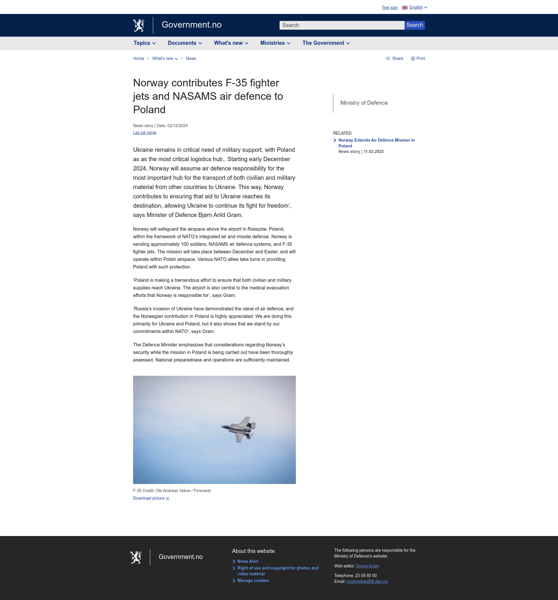 https://www.regjeringen.no/en/aktuelt/norge-bidrar-med-f-35-kampfly-og-nasams-luftvern-til-polen/id3077494/