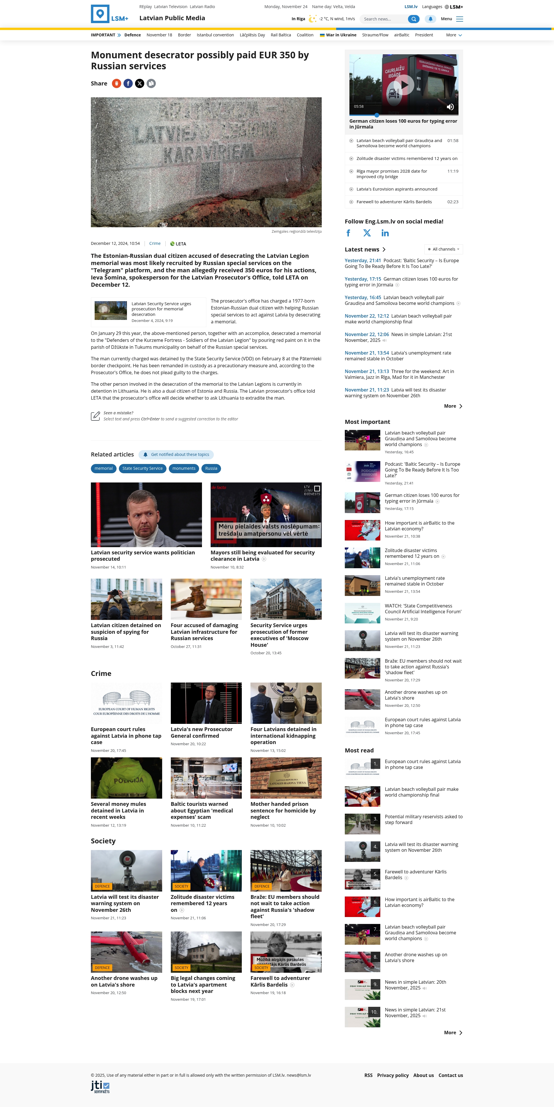 - "The Estonian-Russian dual citizen accused of desecrating the Latvian Legion memorial was most likely recruited by Russian special services on the 'Telegram' platform, and the man allegedly received 35..."