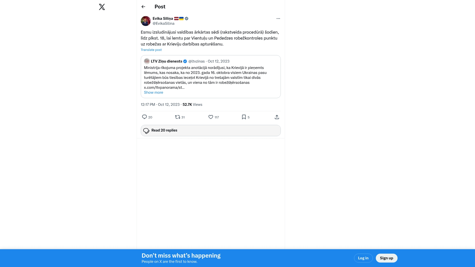 "Official statement by Latvian PM on X confirming emergency government meeting and intention to suspend border checkpoints with Russia.",