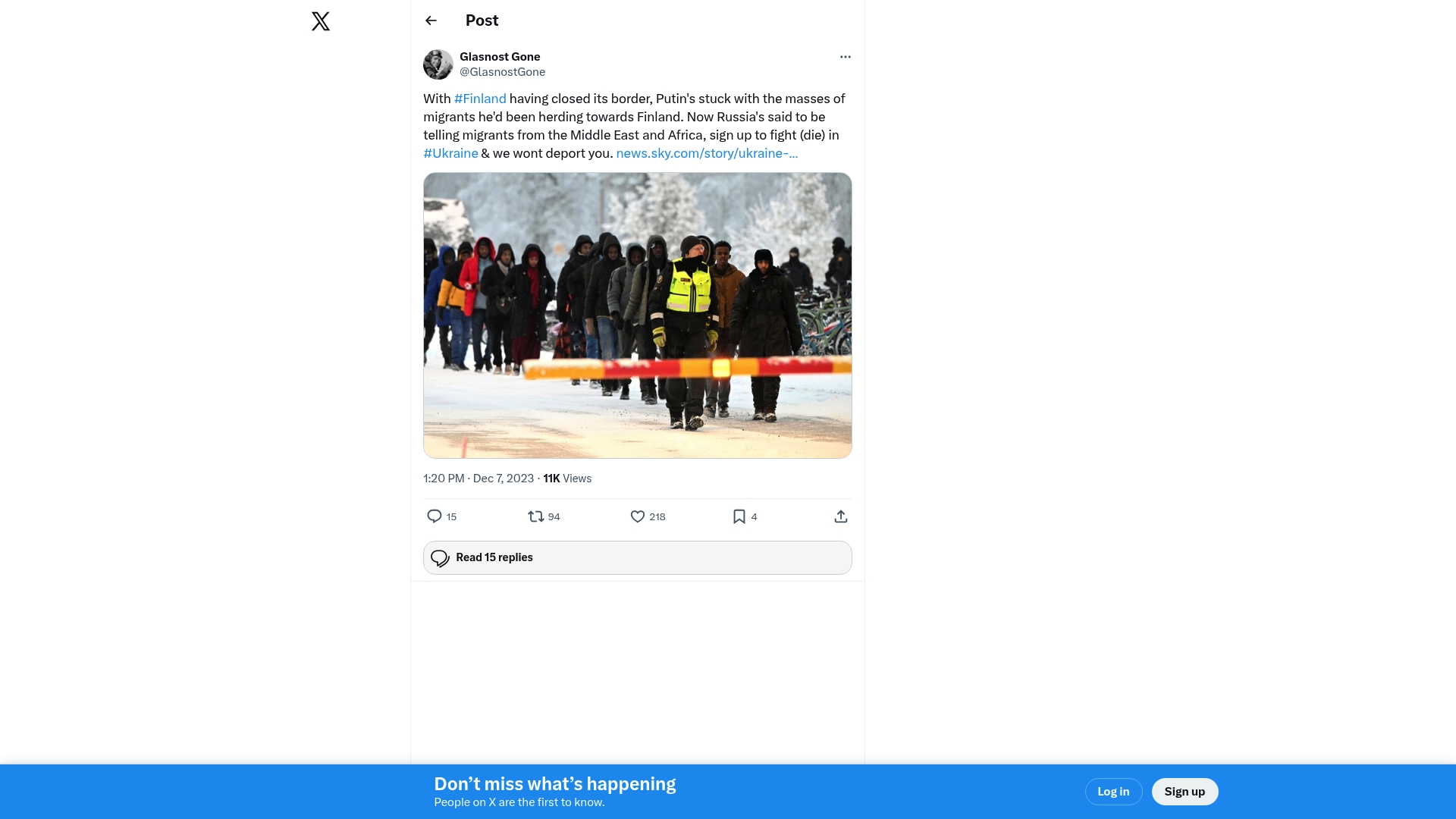 - "With #Finland having closed its border, Putin's stuck with the masses of migrants he'd been herding towards Finland."