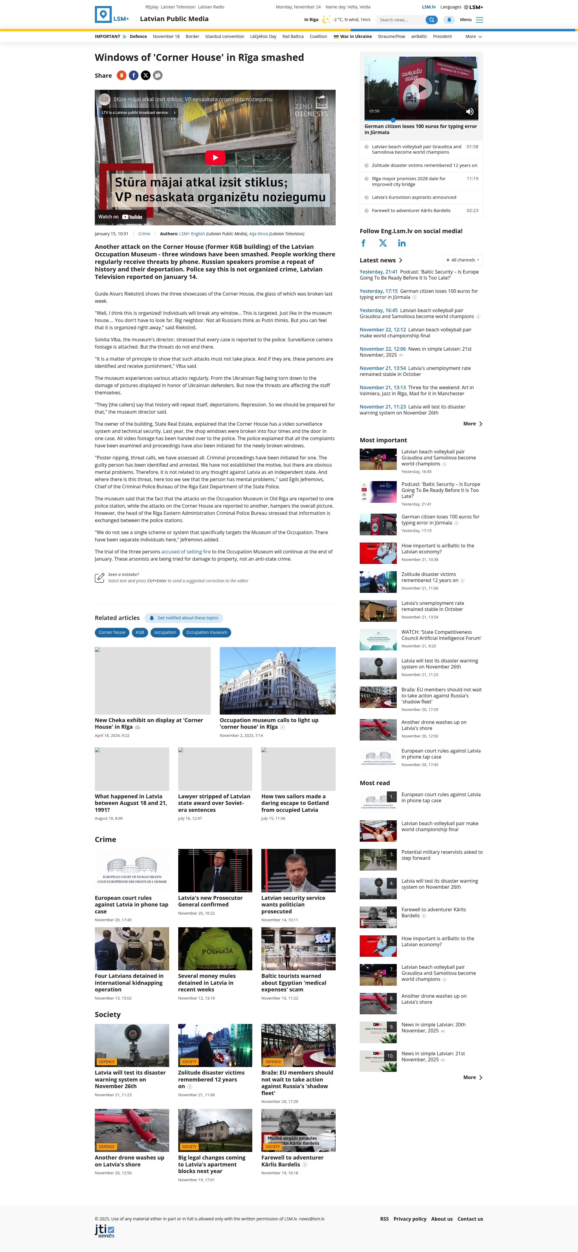 Short Summary: Windows at the Latvian Occupation Museum's Corner House in Riga were smashed, with ongoing police investigations and prior threats reported. Organized crime has been ruled out.
