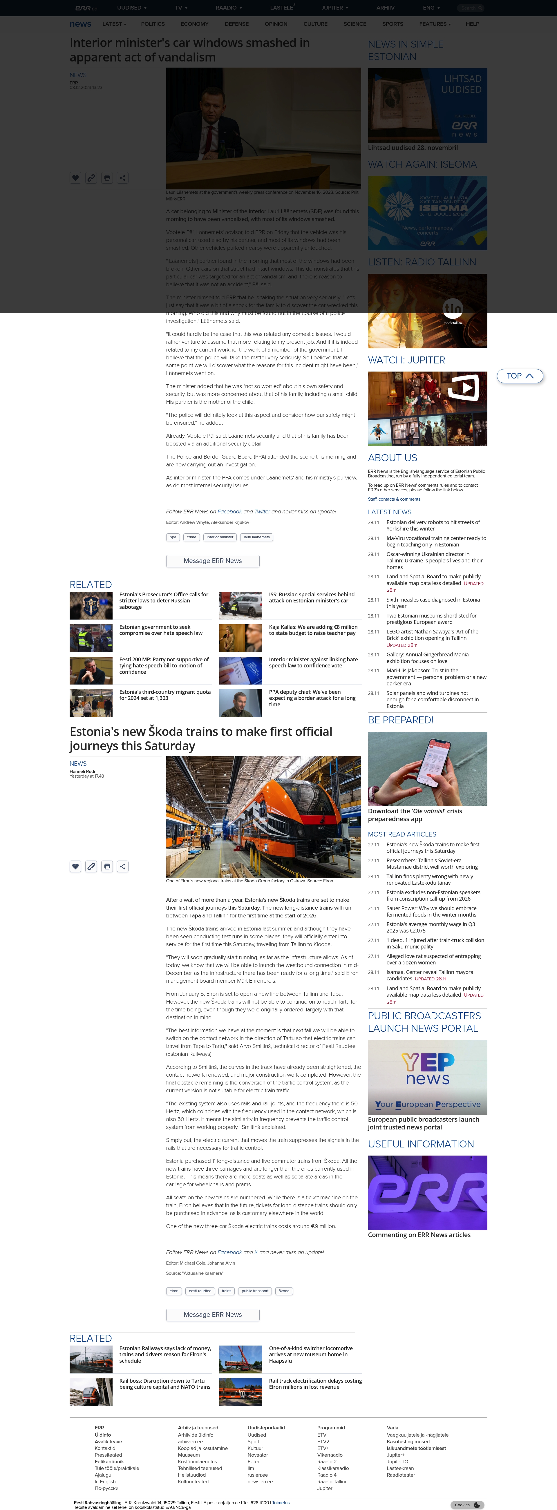 A car belonging to Estonia's Minister of the Interior, Lauri Läänemets, was vandalized on the morning of December 8, 2023, with most of its windows smashed. Other nearby vehicles were reportedly undisturbed. The minister described the situation as very serious and indicated that authorities are investigating the incident. He expressed concern primarily for his family's safety. Police and Border Guard attended the scene and are conducting an investigation. The minister's security has been increased as a precaution.