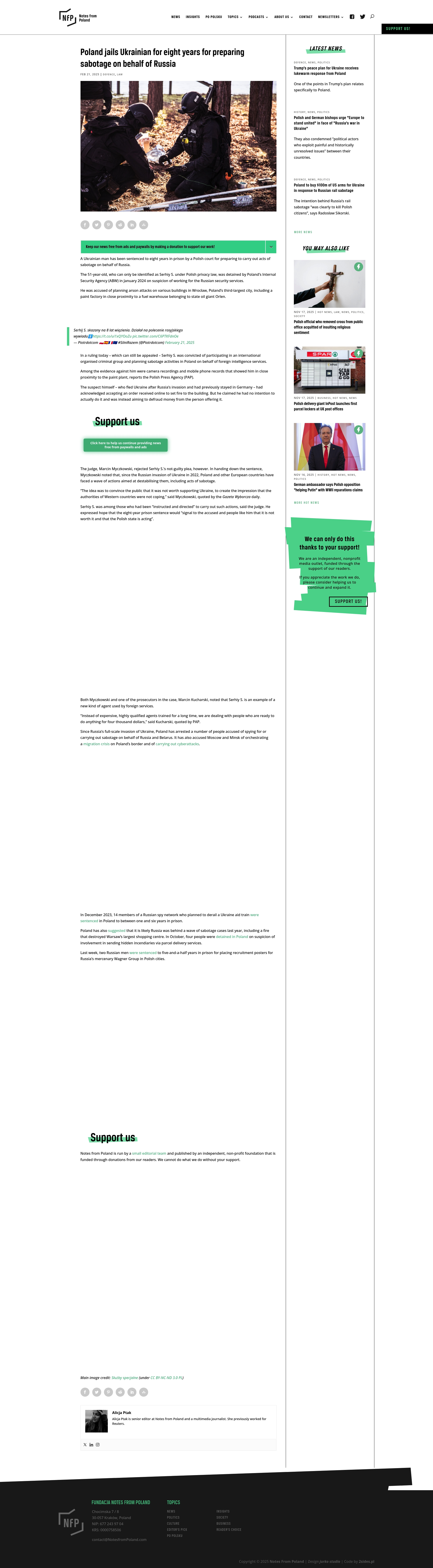 - "A Polish court has sentenced a Ukrainian man to eight years in jail for preparing an act of sabotage on behalf of Russian intelligence services."