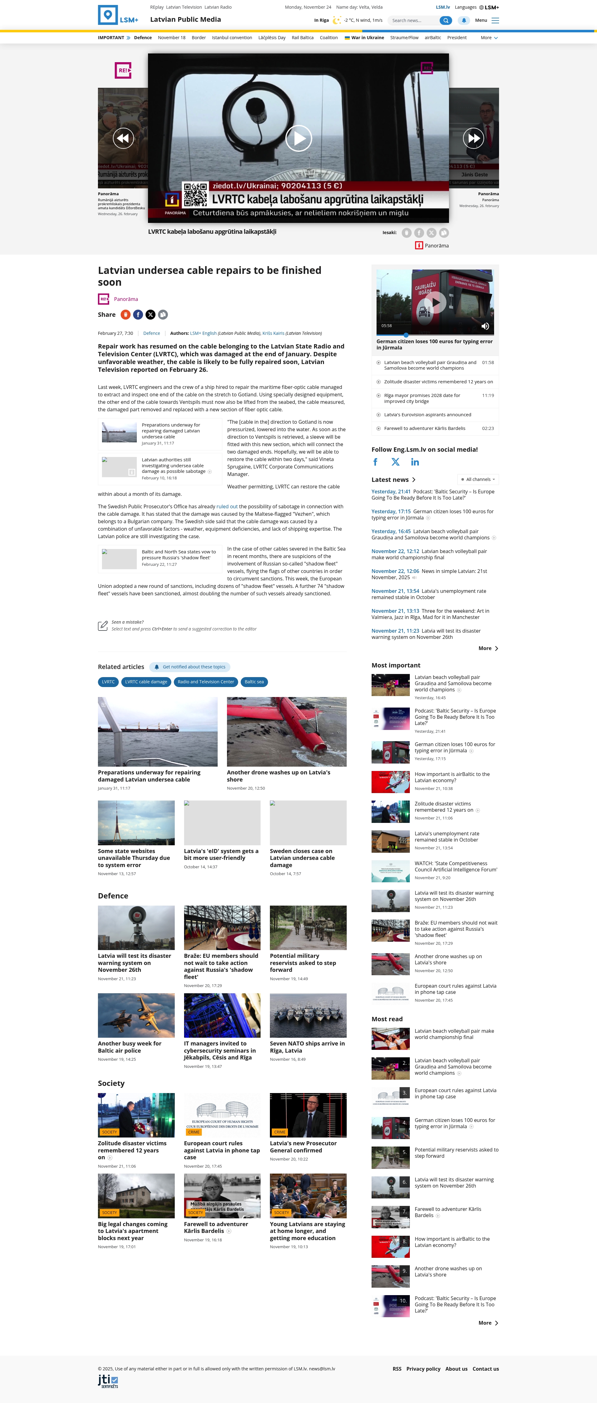 - "Repair work has resumed on the cable belonging to the Latvian State Radio and Television Center (LVRTC), which was damaged at the end of January."