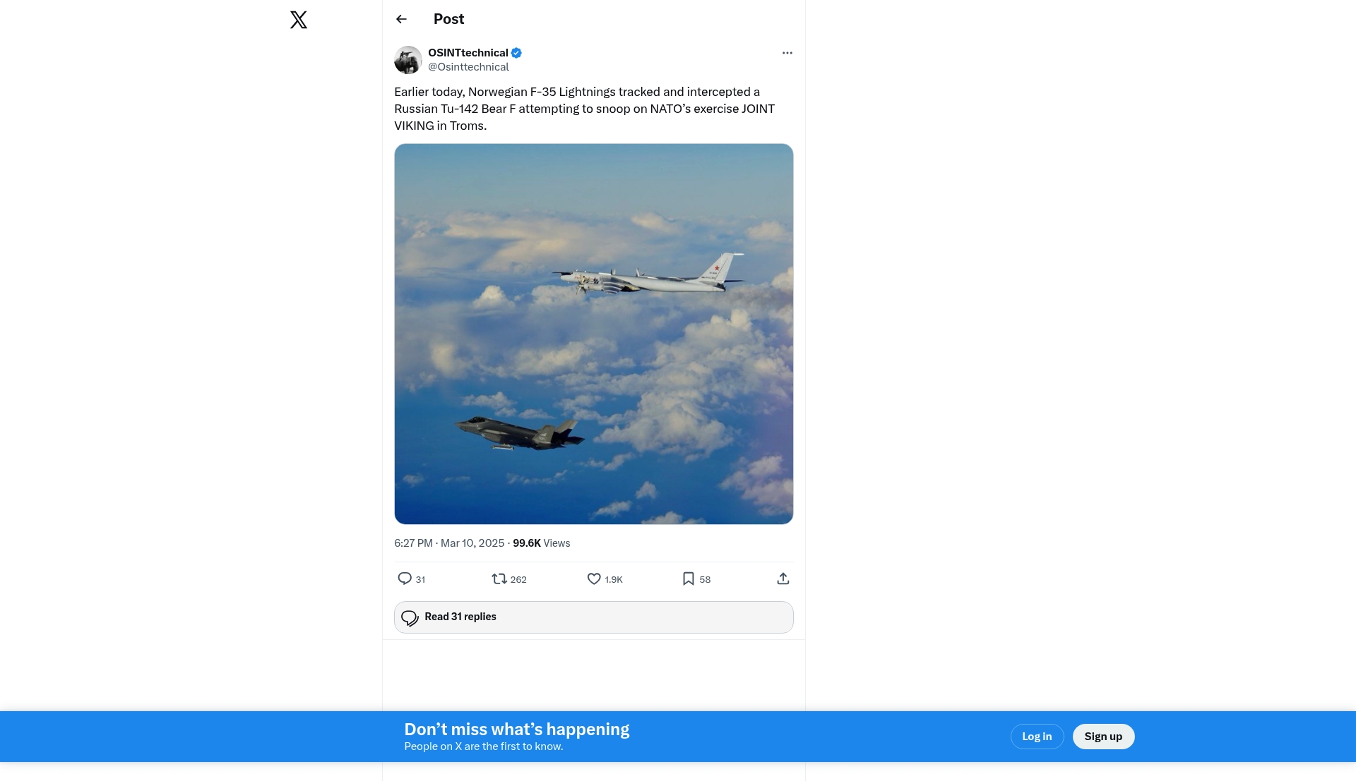 - "Earlier today, Norwegian F-35 Lightnings tracked and intercepted a Russian Tu-142 Bear F attempting to snoop on NATOβs exercise JOINT VIKING in Troms."