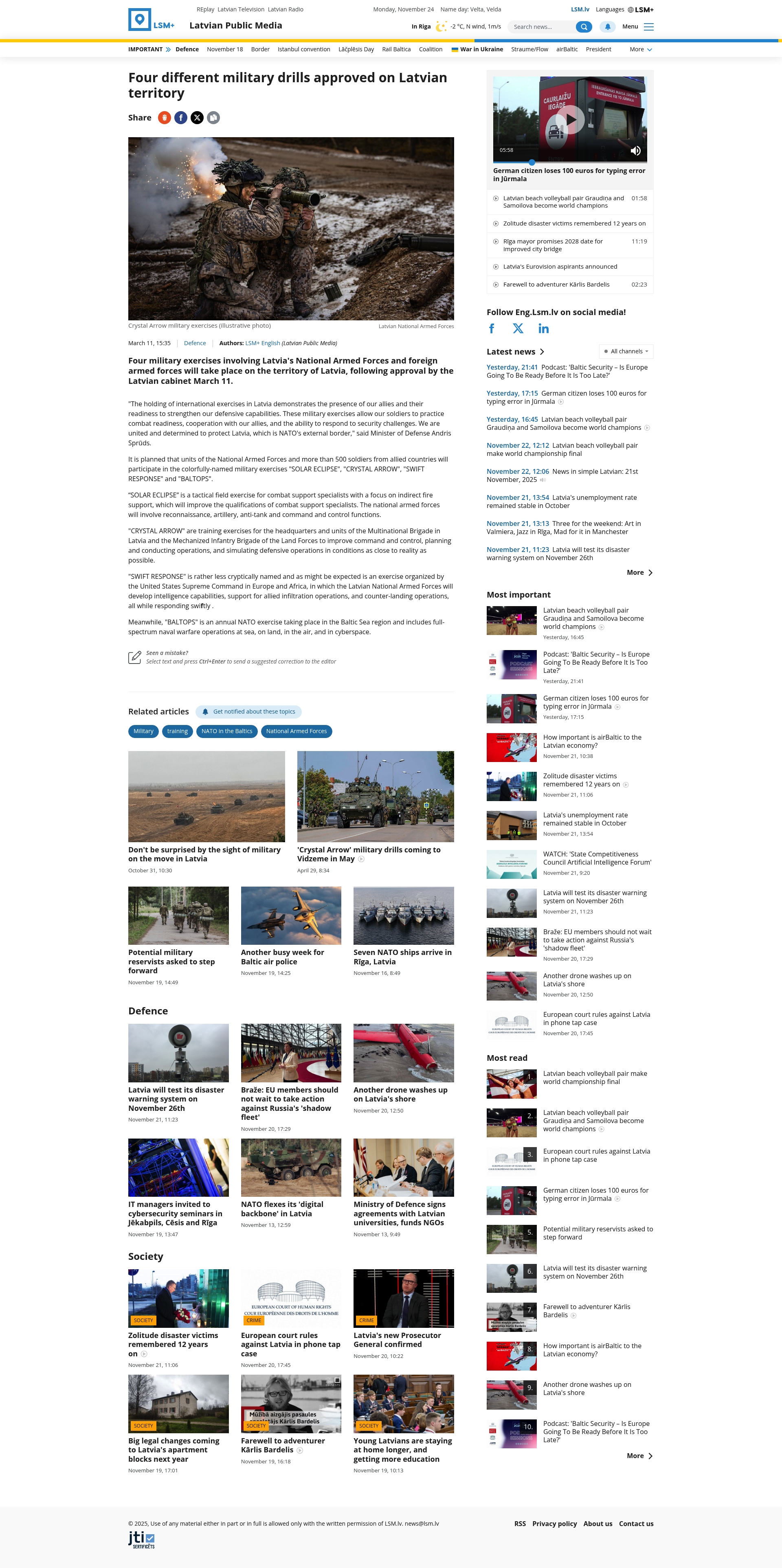 - "Four military exercises involving Latvia's National Armed Forces and foreign armed forces will take place on the territory of Latvia, following approval by the Latvian cabinet March 11."