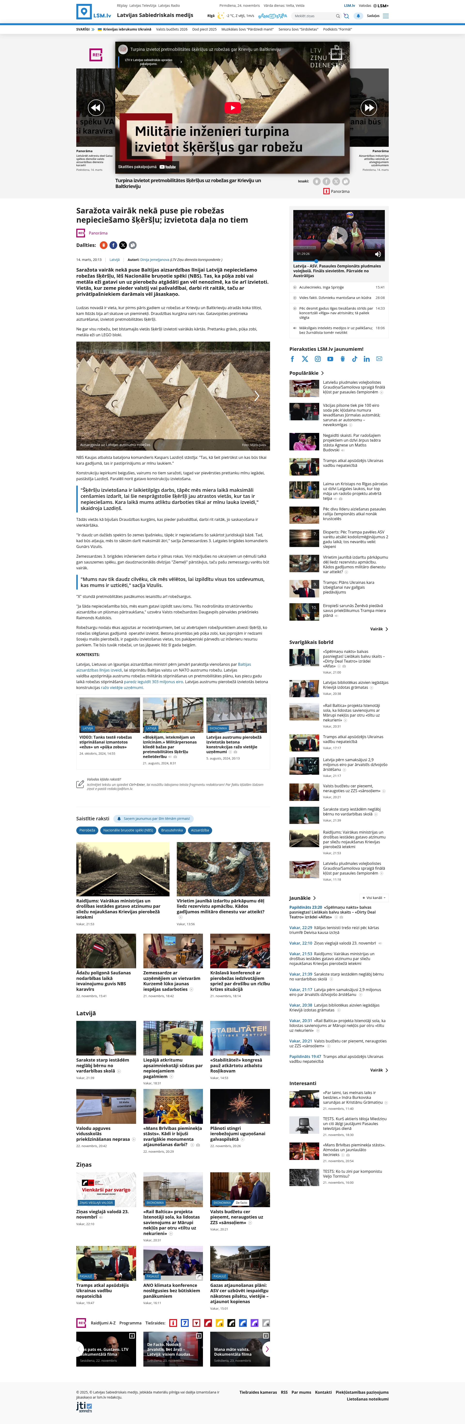 - "Saražota vairāk nekā puse pie Baltijas austrumu robežas aizsardzībai nepieciešamo metāla šķēršļu. NBS, tostarp militārie inženieri, turpina pie robežas ar Krieviju un Baltkrieviju izvietot prettanku š..."