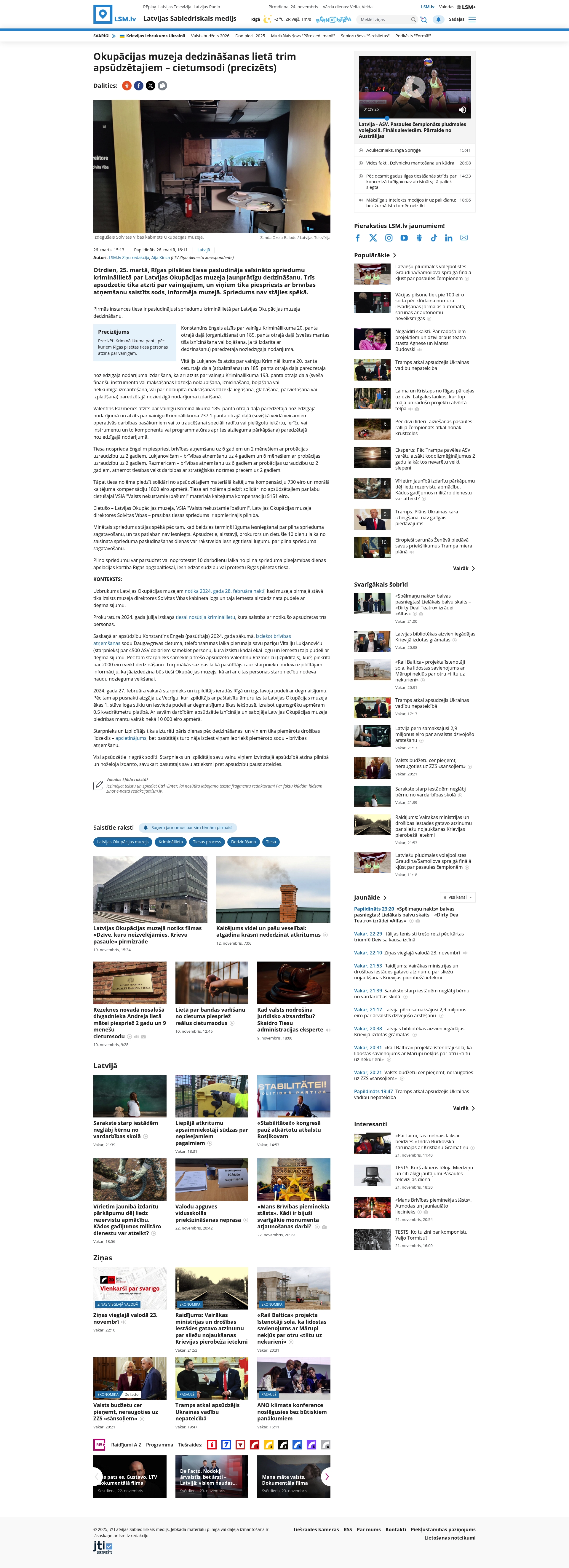 - "Otrdien, 25. martā, Rīgas pilsētas tiesa pasludināja saīsināto spriedumu krimināllietā par Latvijas Okupācijas muzeja jumtgrupas dedzināšanu. Trīs apsūdzētie saņēma cietuma vai piespiedu darbu, un spr..."