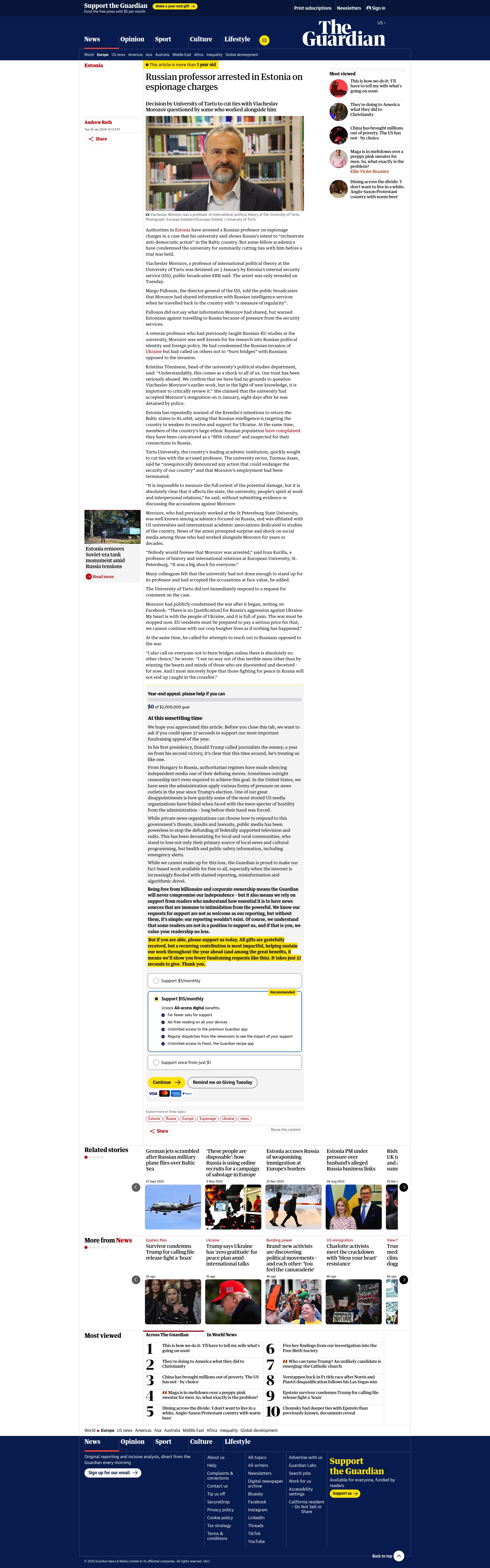 - "Viacheslav Morozov, a professor of international political theory at the University of Tartu... was arrested on suspicion of spying for Moscow."