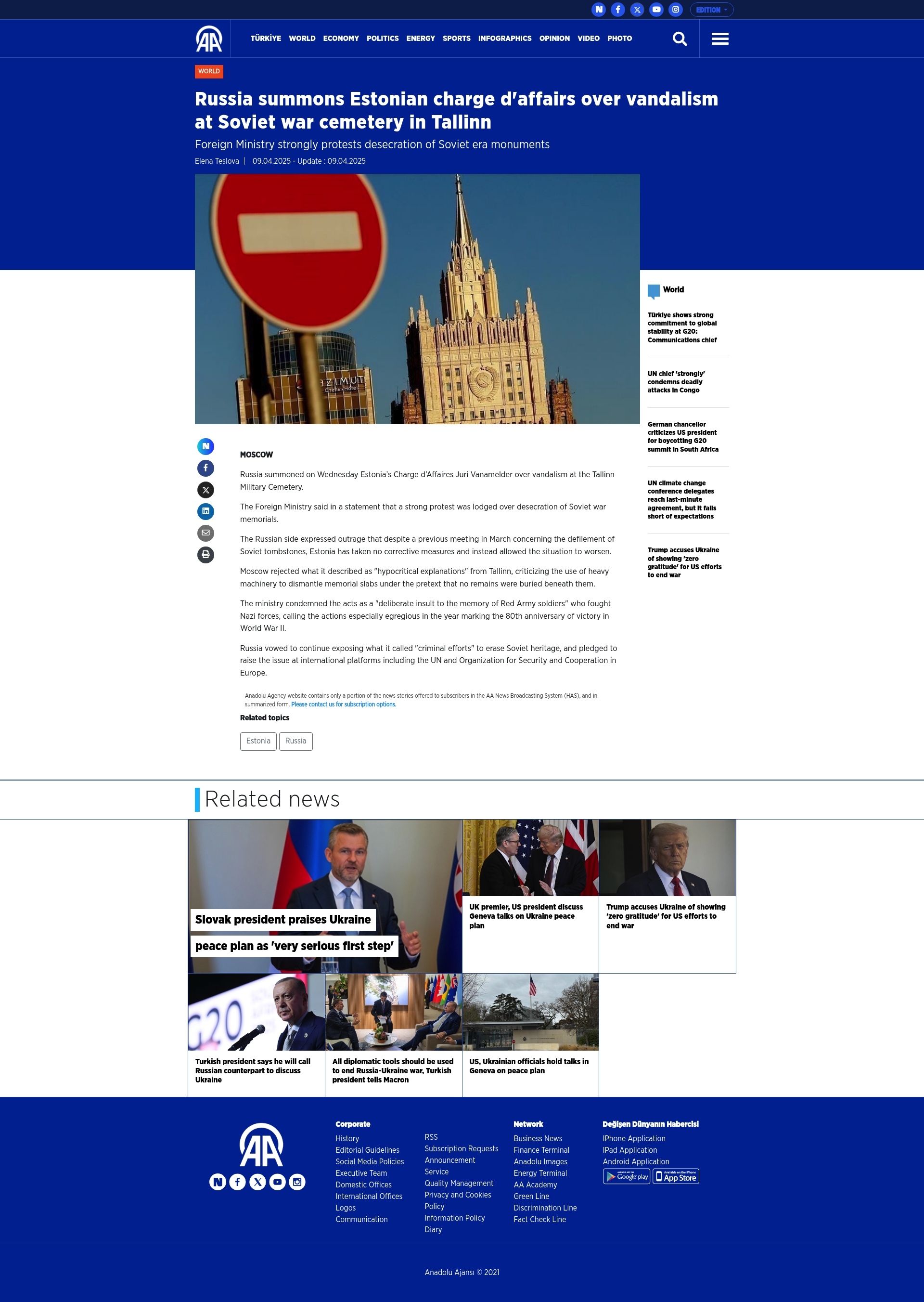 Headline: Russia summons Estonian charge d’affaires over vandalism at Soviet war cemetery in Tallinn