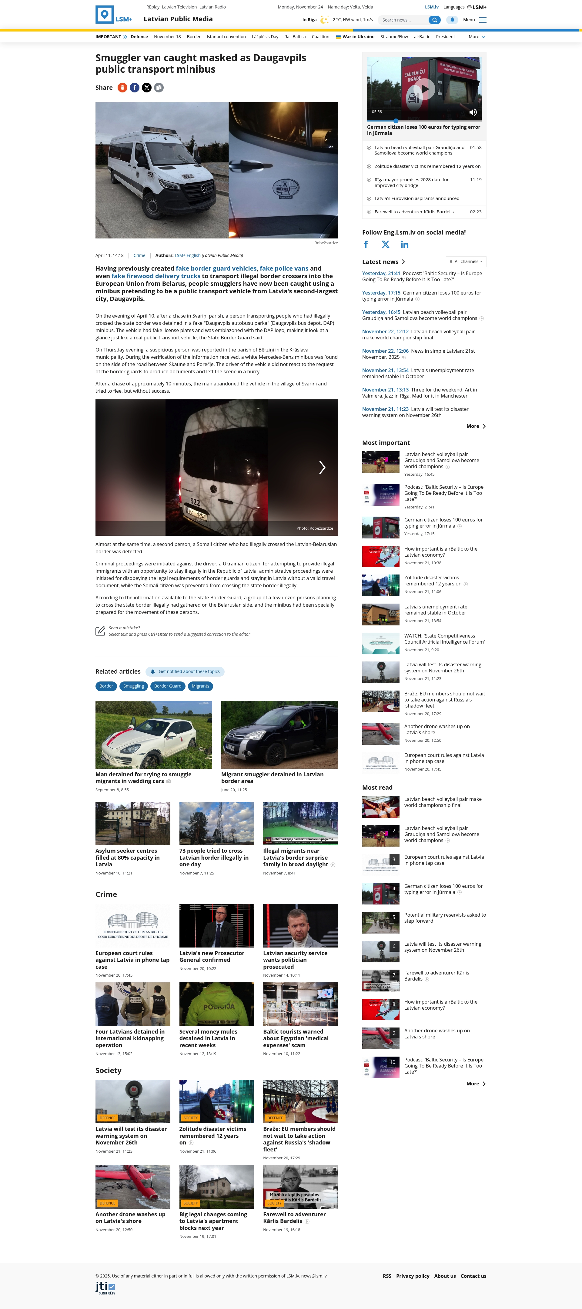 Latvian Border Guard intercepted a van disguising itself as a public transport minibus from Daugavpils to illegally transport migrants across the Latvia-Belarus border. The vehicle, equipped with fake plates and emblems, attempted to mimic official public transit and was abandoned following a police chase.