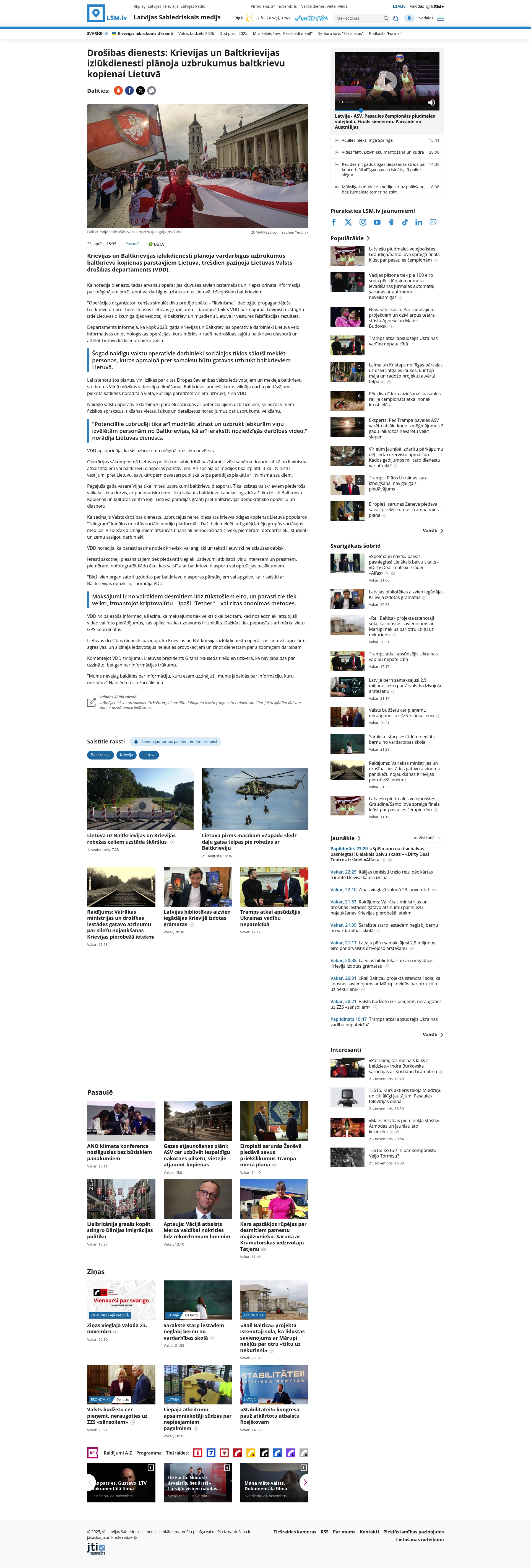 - "Krievijas un Baltkrievijas izlūkdienesti plānoja vardarbīgus uzbrukumus baltkrievu kopienas pārstāvjiem Lietuvā, tiesiem paziņoja Lietuvas Valsts drošības departaments (VDD)."
