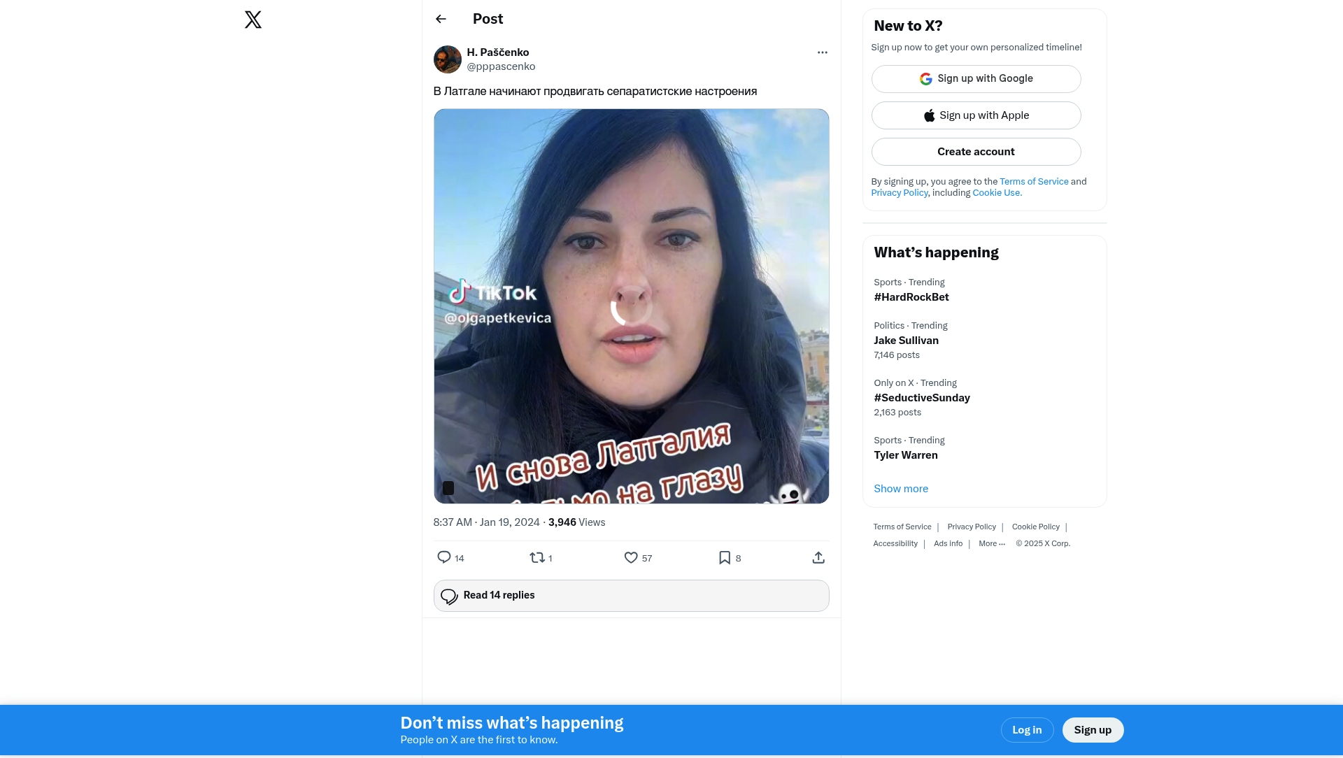 A post claims that separatist sentiments are beginning to be promoted in the Latgale region of Latvia, accompanied by a TikTok video that appears to discuss Latgale in Russian.