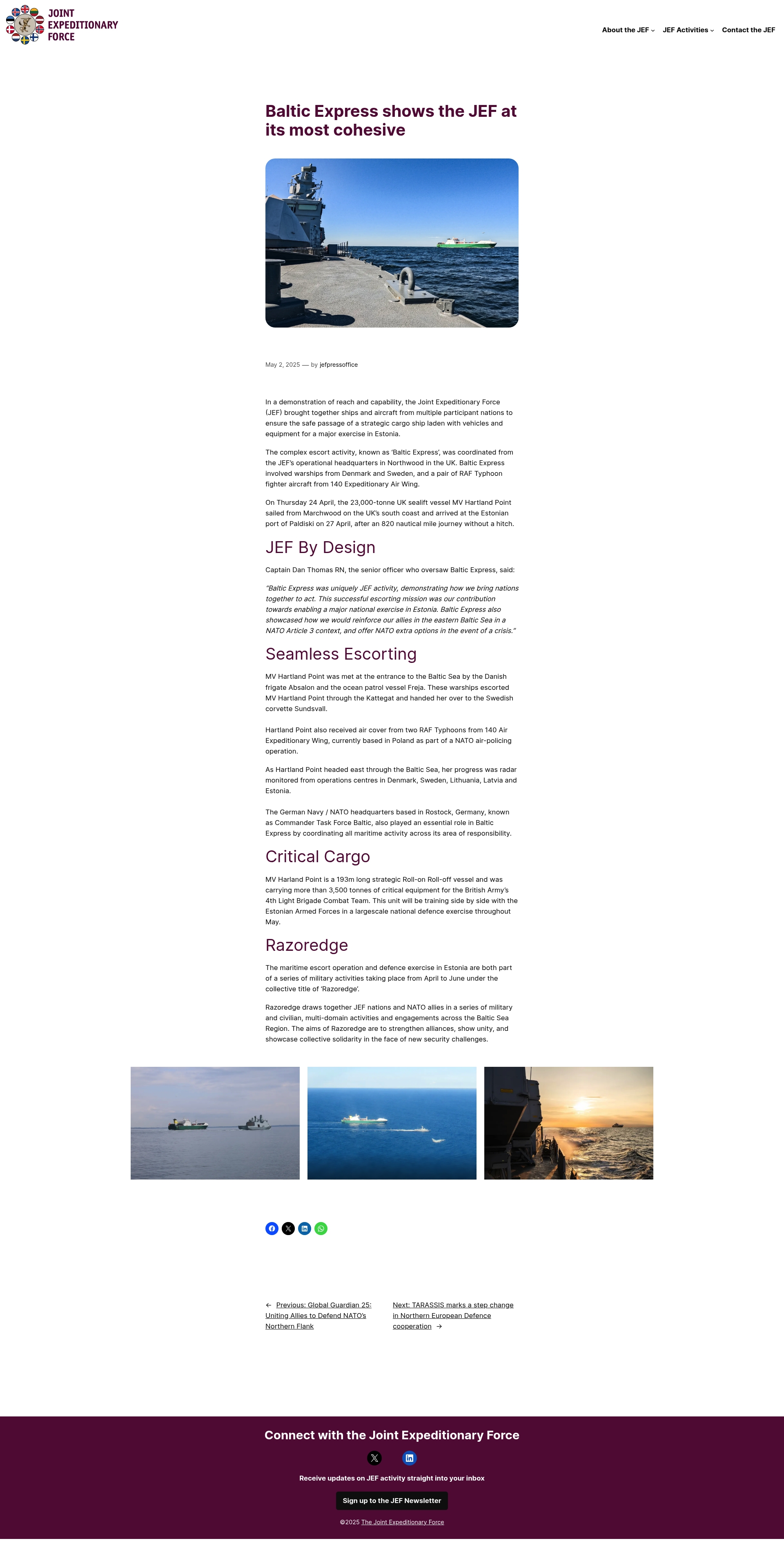 Joint Expeditionary Force (JEF) nations coordinated a complex operation known as Baltic Express in late April 2025, demonstrating naval and air escort for critical military cargo through the Baltic Sea into Estonia. UK, Danish, Swedish, and German/NATO assets participated, with multiple escort transits and air support, exemplifying multinational military cohesion in the Baltic region.