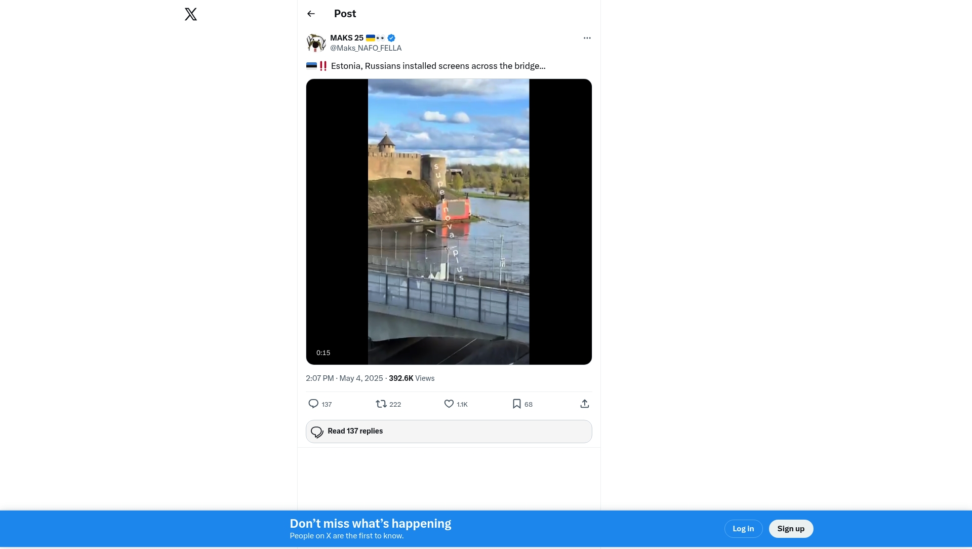 A social media post claims that Russians installed screens across a bridge between Russia and Estonia, implying a possible increase in border control or deterrence measures. Video evidence shows a physical barrier being installed on the river, adjacent to a bridge at the Estonia-Russia border.