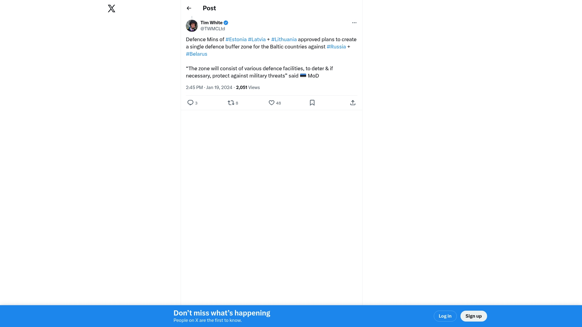 - "Defence Mins of #Estonia #Latvia + #Lithuania approved plans to create a single defence buffer zone for the Baltic countries against #Russia + #Belarus"