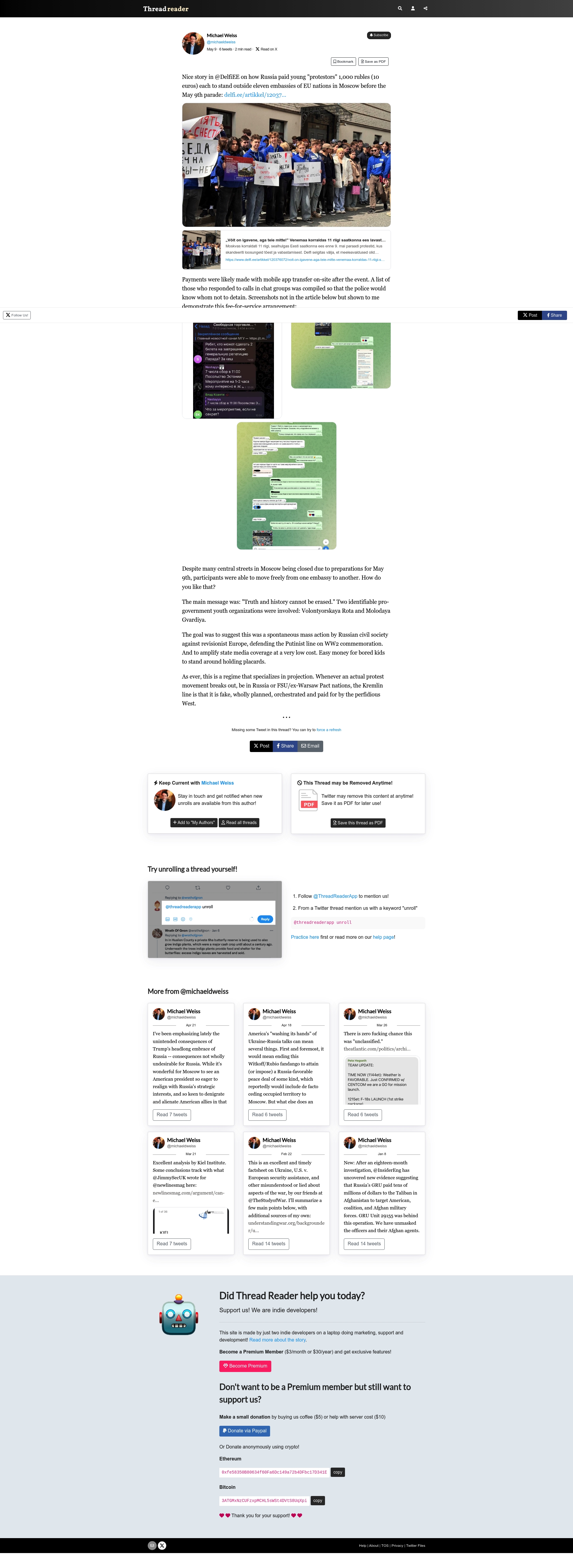 - "Russian paid young 'protestors' 1,000 rubles (for every exit) to stand outside even embassies of EU nations in Moscow before the May 9th parade"