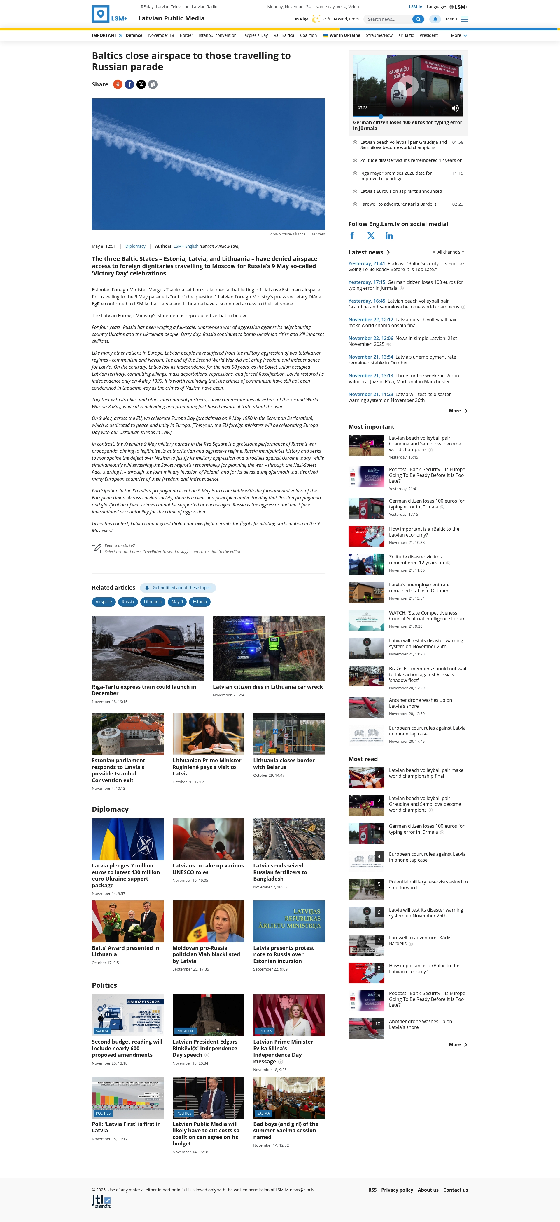 "url": "https://eng.lsm.lv/article/politics/diplomacy/08.05.2025-baltics-close-airspace-to-those-travelling-to-russian-parade.a598178/"