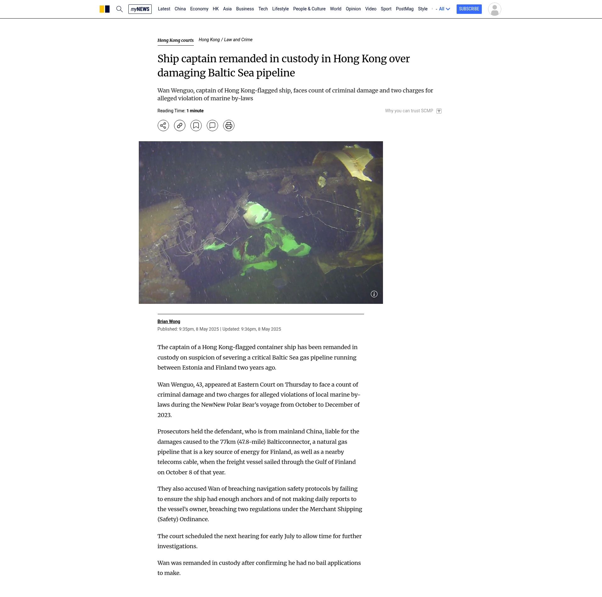 Headline: Ship captain remanded in custody in Hong Kong over damaging Baltic Sea pipeline