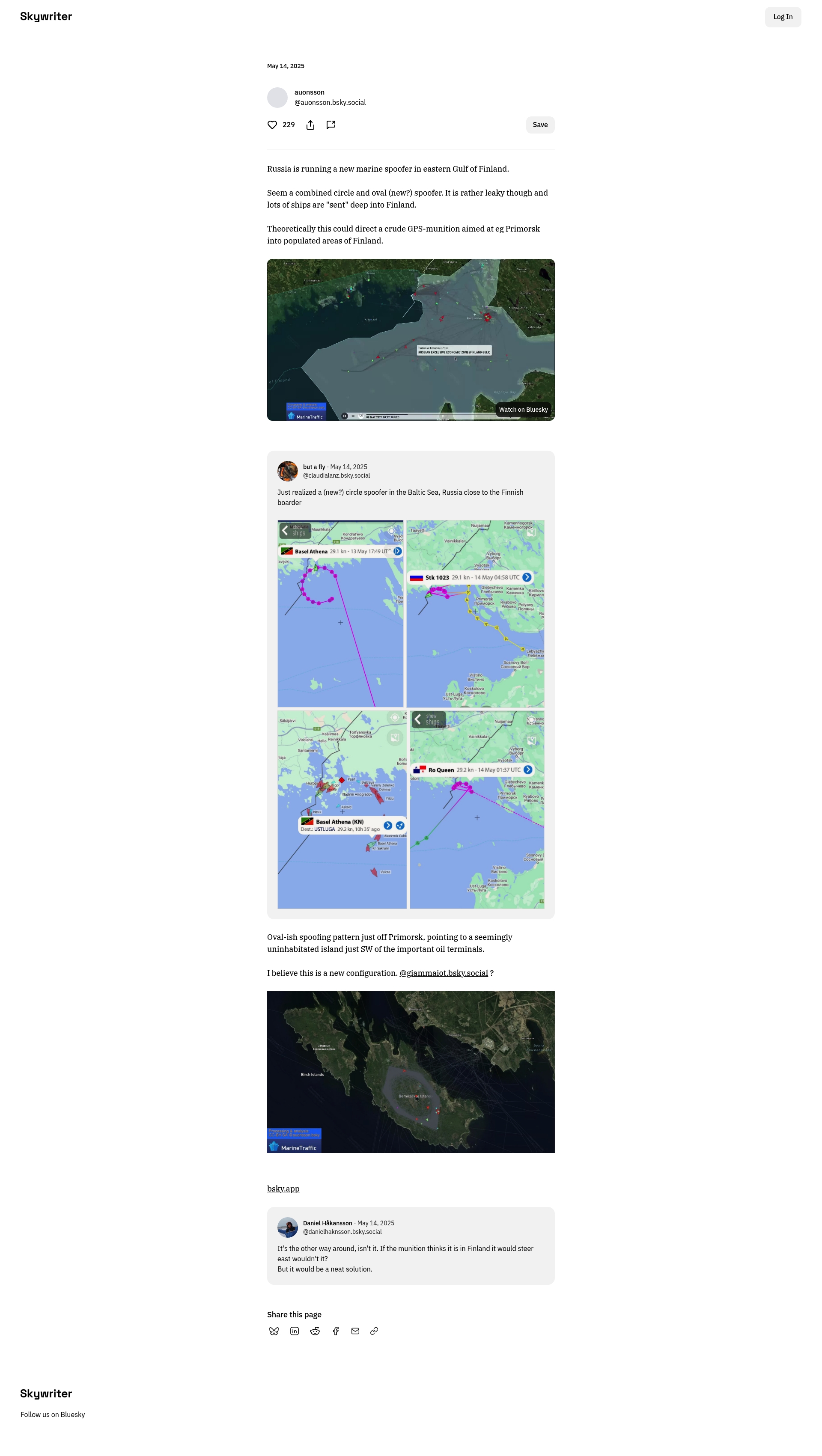 Reports and visual evidence indicate that Russia is operating a new marine GPS spoofing system in the eastern Gulf of Finland near Primorsk, close to the Finnish border. The reported spoofing pattern is a combined circle and oval shape, which appears to be affecting marine traffic by erroneously sending ship locations deep into Finnish territory. The potential for this spoofing to direct GPS-guided munitions into Finland is theorized.
