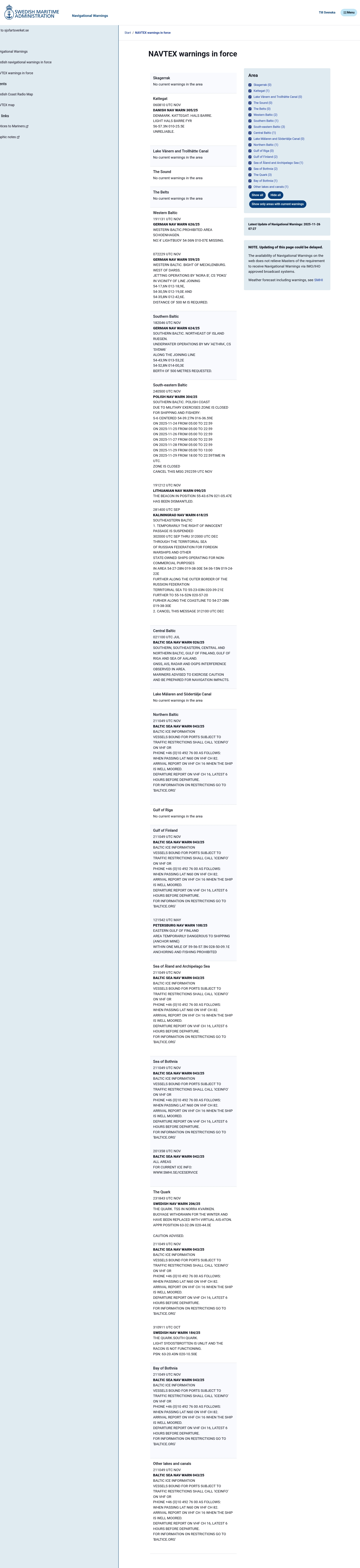 The Swedish Maritime Administration has issued current NAVTEX warnings in force across multiple maritime regions including the Baltic Sea, the Gulf of Bothnia, the Kattegat, and surrounding areas. These warnings alert maritime traffic to hazards such as navigation exercises, obstructions, and maintenance works that may impact maritime safety. Update notes highlight ongoing navigation warnings and cautionary measures for vessels traversing these areas. The warnings are issued to ensure safe navigation and prevent accidents at sea.