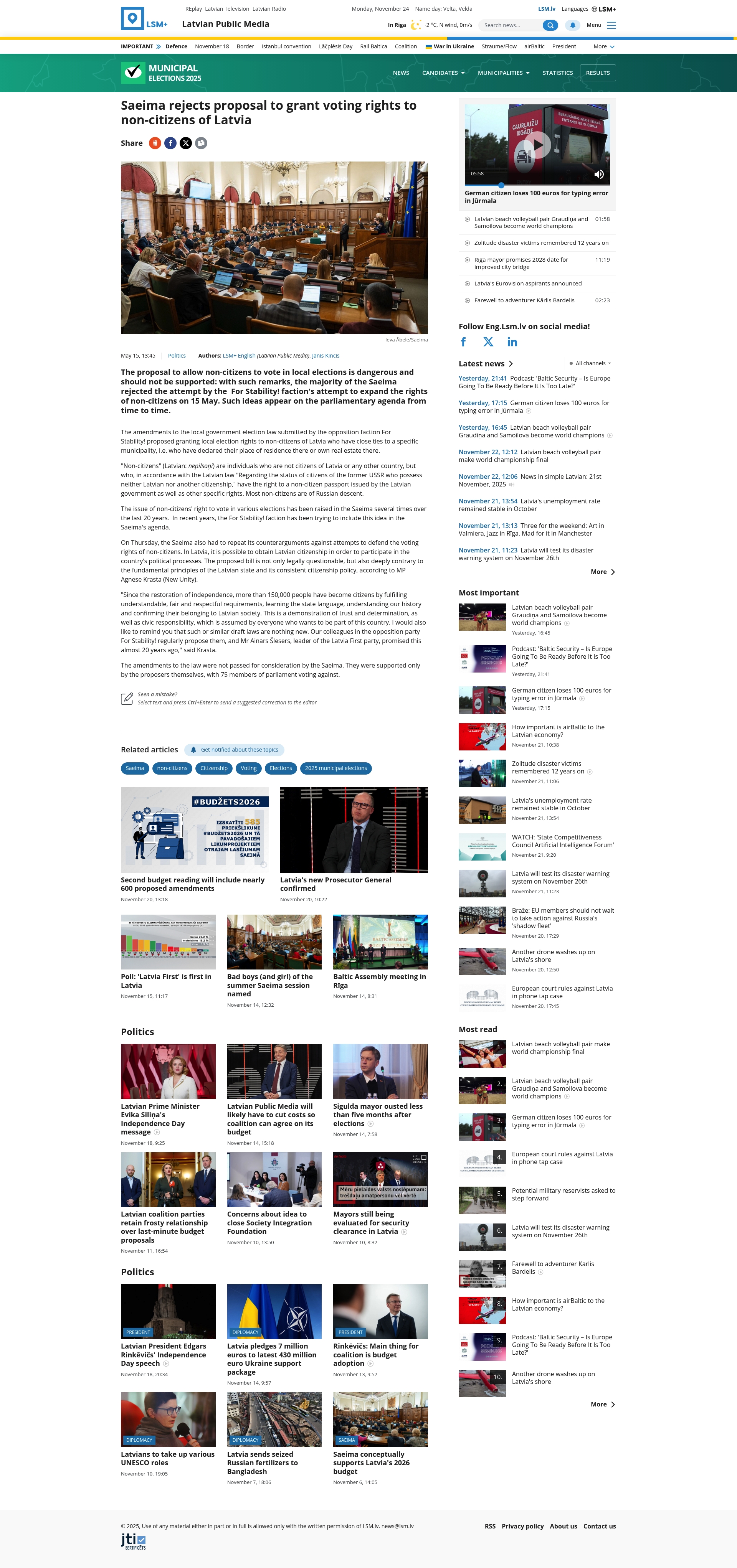 - "The proposal to allow non-citizens to vote in local elections is dangerous and should not be supported: with such remarks, the majority of the Saeima rejected the attempt by the 'For Stability!' facti..."