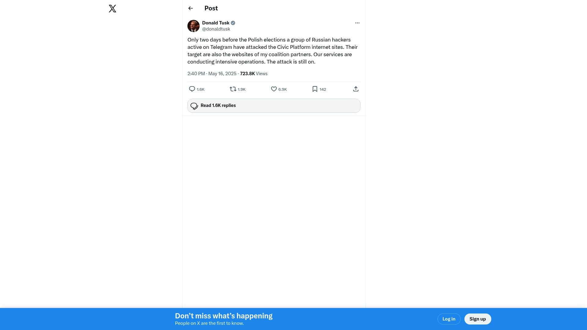 According to a statement by Donald Tusk, a group of Russian hackers active on Telegram attacked the Civic Platform party websites and websites of coalition partners just two days before the Polish elections. Polish services are responding, and the attack is ongoing.