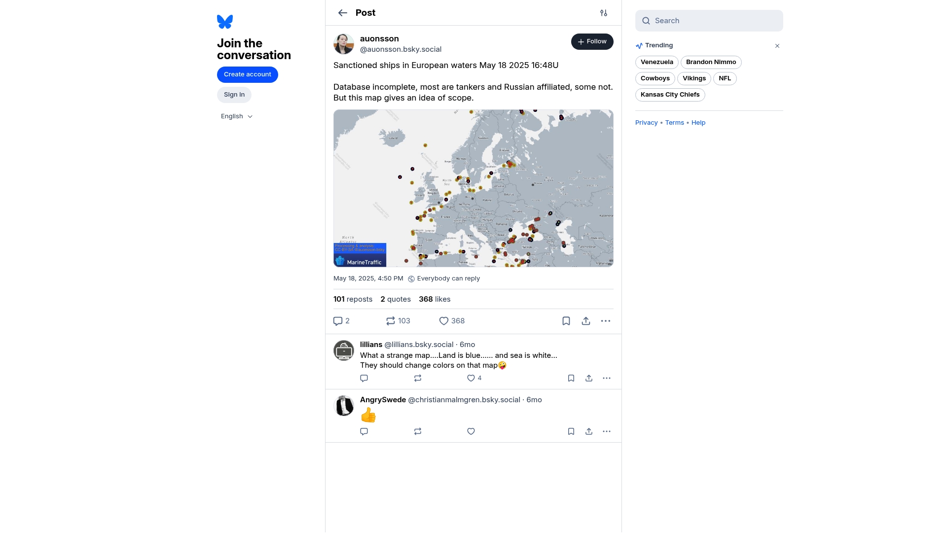 A post highlights the presence of sanctioned ships, most of which are tankers and Russian affiliated, in European waters as of May 18, 2025. A map visualization demonstrates the geographic scope of these vessels across the region.