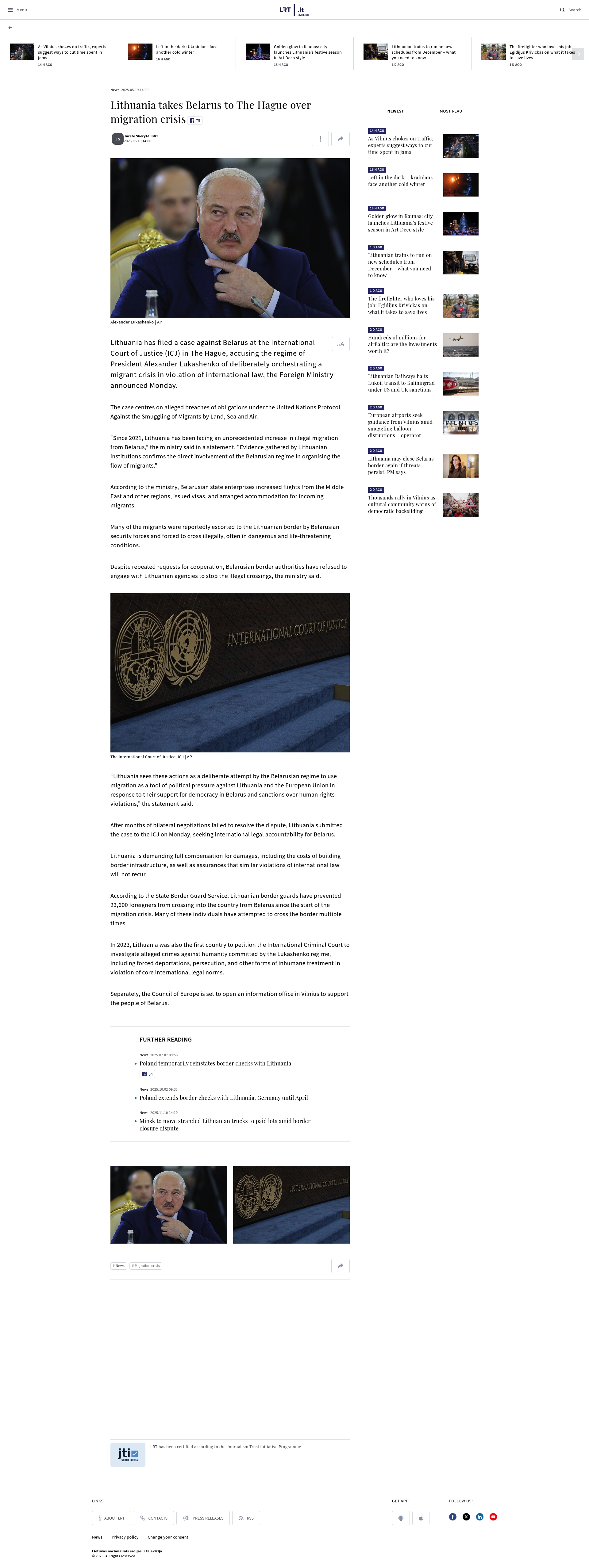 - "Lithuania has filed a case against Belarus at the International Court of Justice (ICJ) in The Hague, accusing the regime of President Alexander Lukashenko of deliberately orchestrating a migrant crisi..."