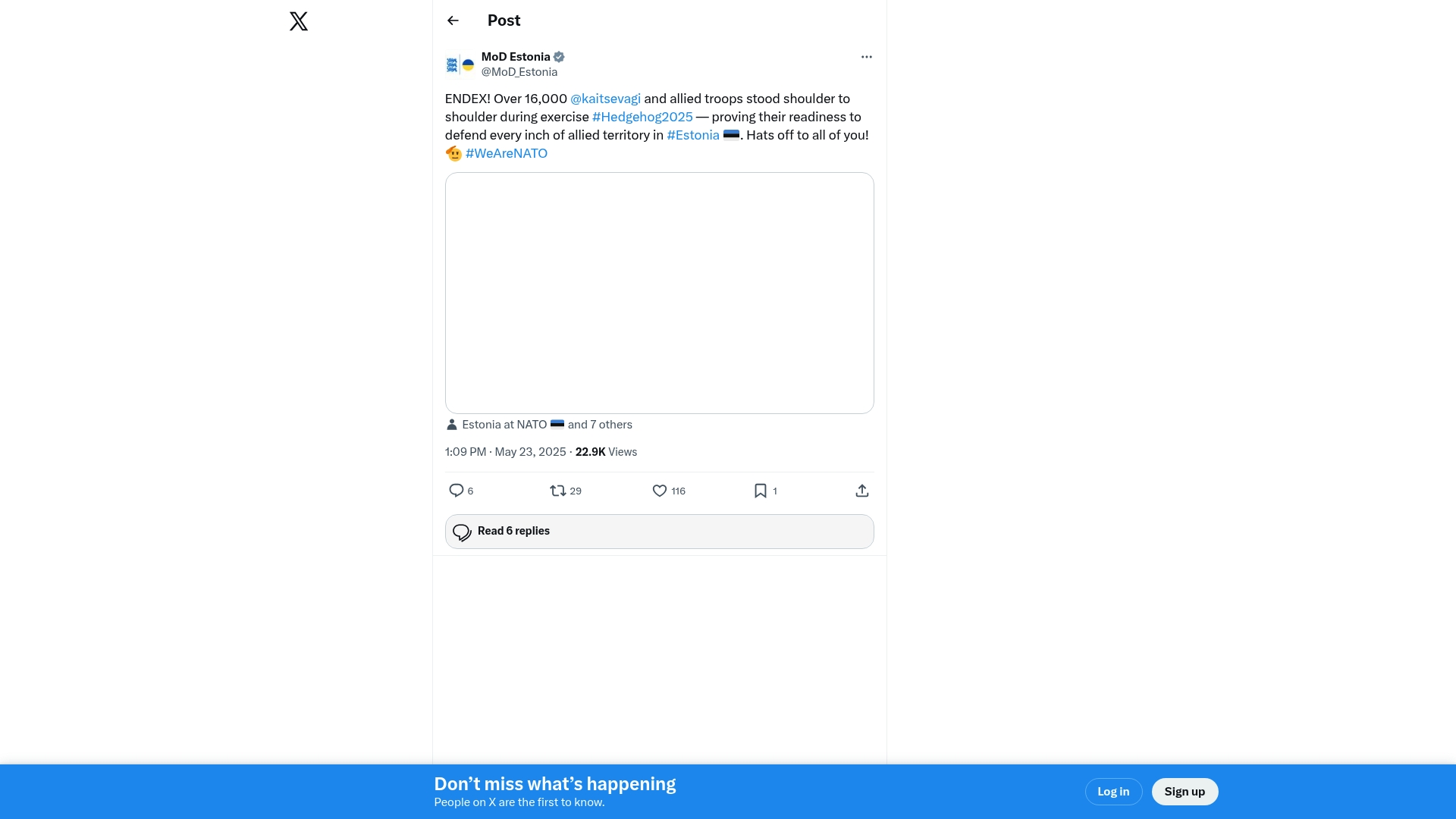 - "ENDEX! Over 16,000 @kaitsevagi and allied troops stood shoulder to shoulder during exercise #Hedgehog2025 — proving their readiness to defend every inch of allied territory in #Estonia."