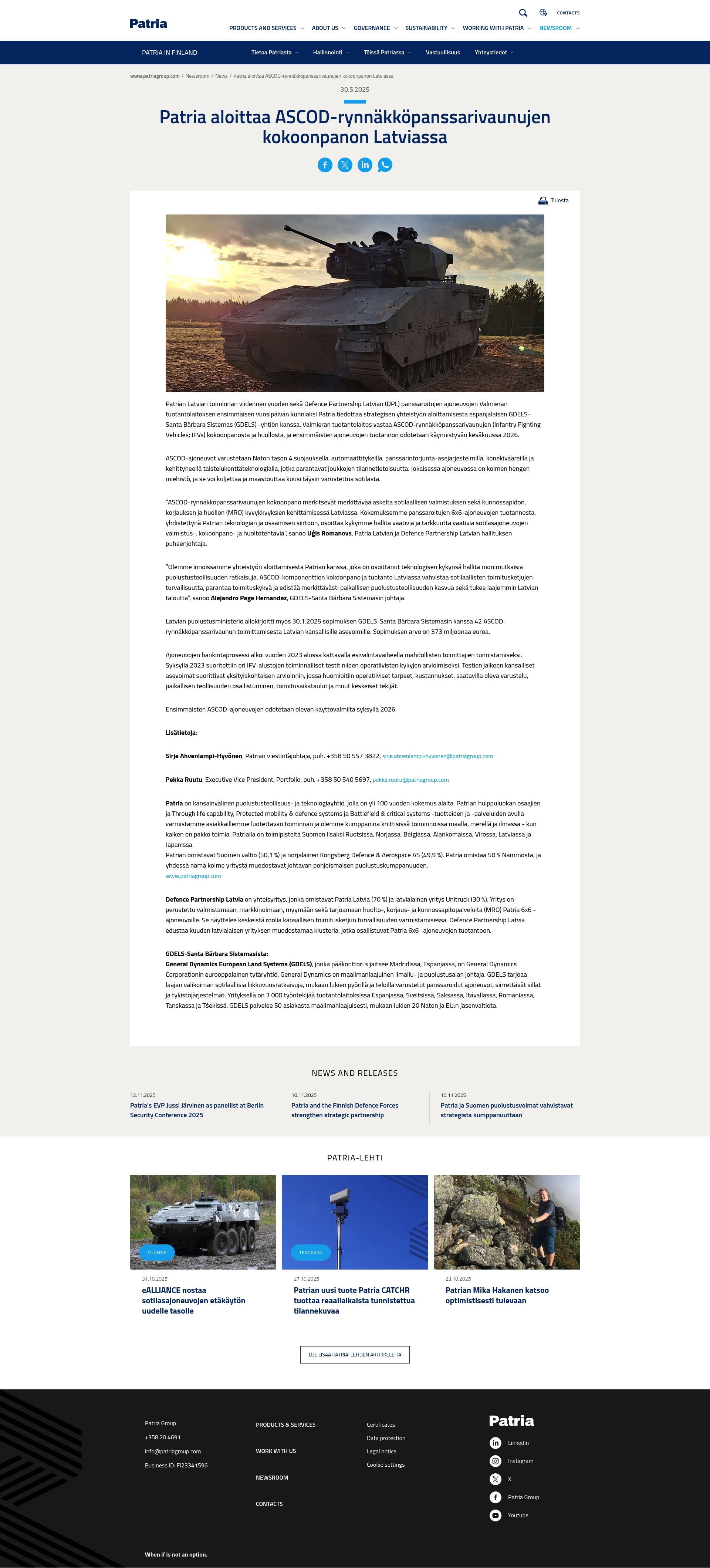 - "Patria aloittaa ASCOD-rynnäkköpanssarivaunujen kokoonpanon Latviassa"