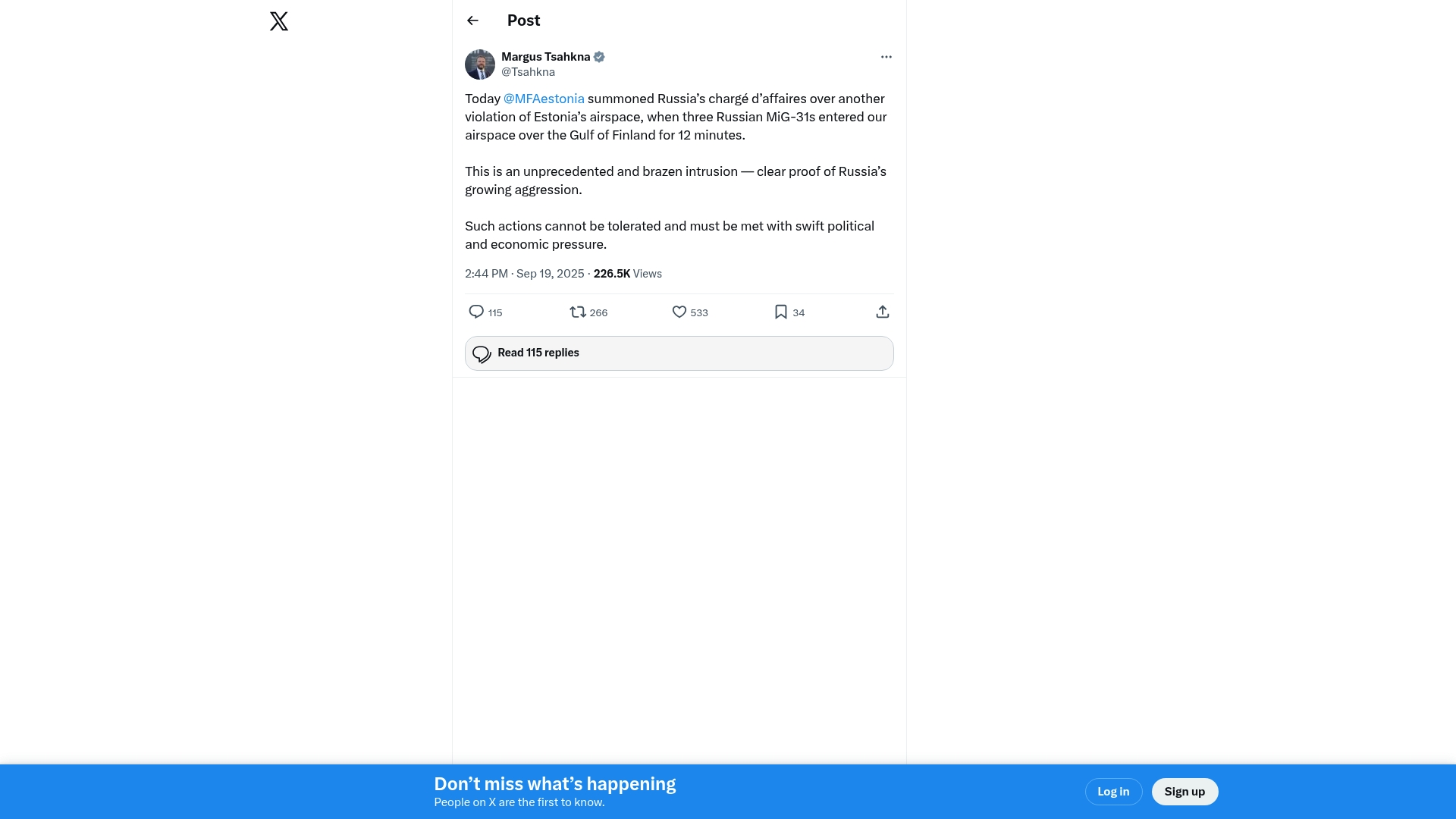 - "Today @MFAestonia summoned Russia’s chargé d’affaires over another violation of Estonia’s airspace, when three Russian MiG-31s entered our airspace over the Gulf of Finland for 12 minutes."