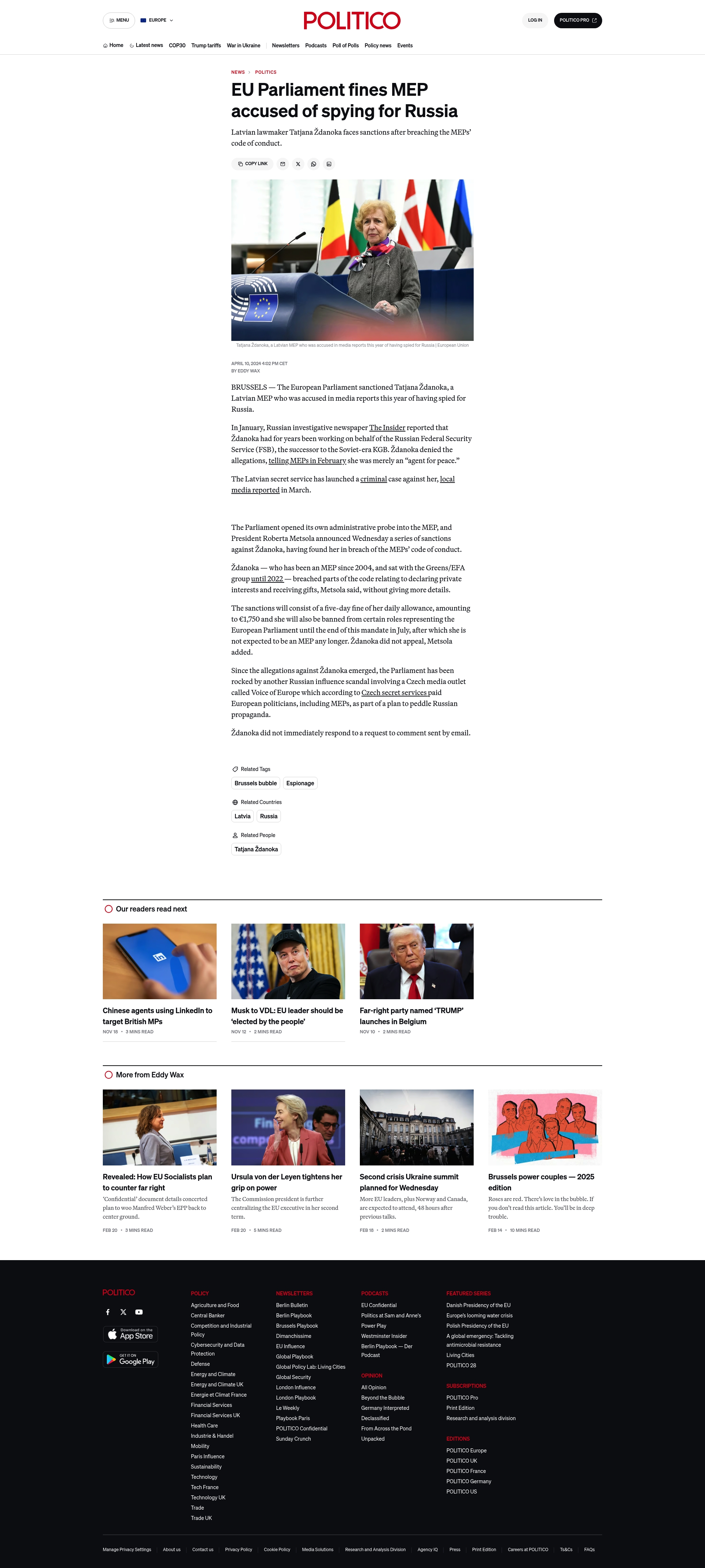 - "The European Parliament sanctioned Tatjana Ždanoka, a Latvian MEP who was accused in media reports this year of having 'spied for Russia.'"