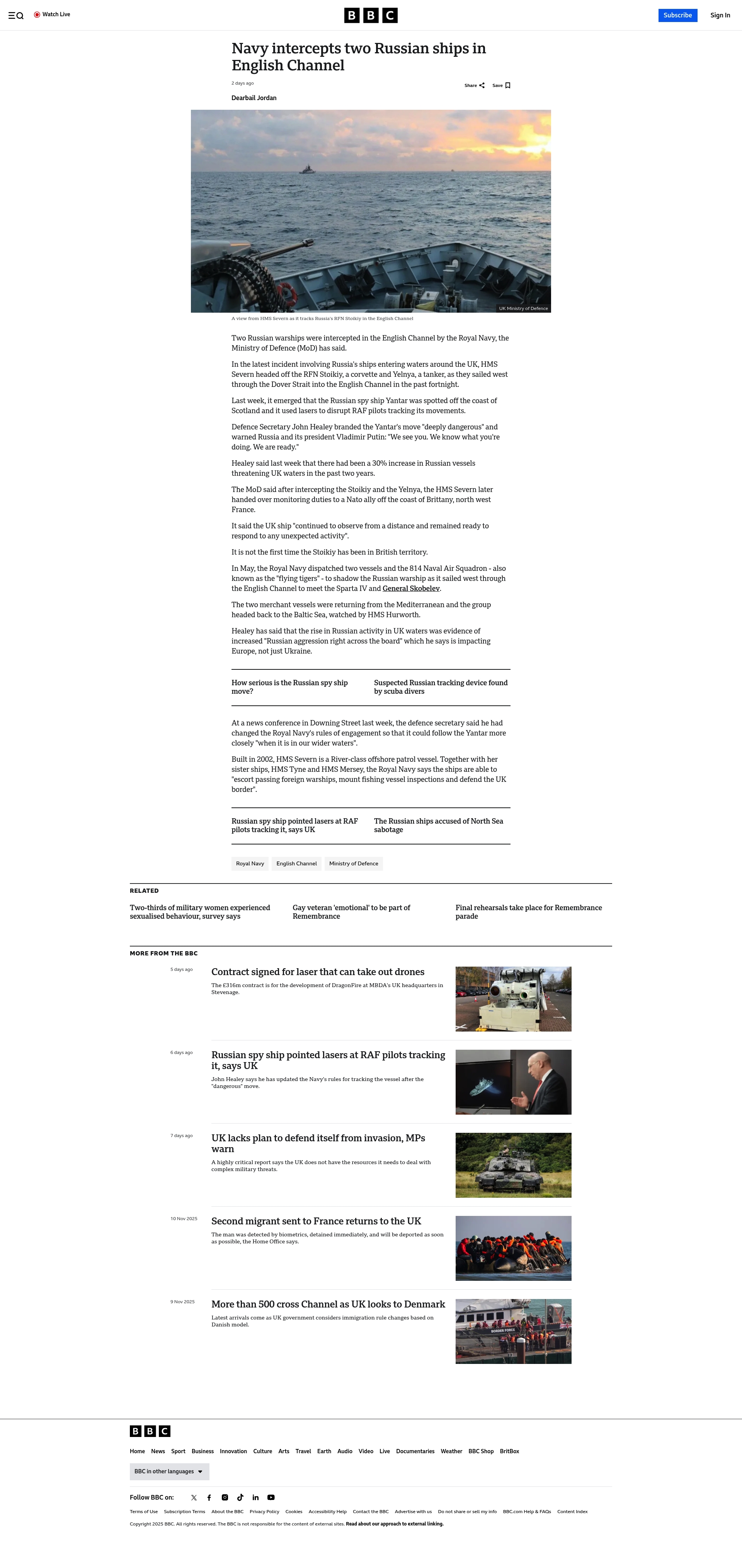On 23 November 2025, the Royal Navy intercepted two Russian ships, a corvette and a tanker, sailing west through the Dover Strait into the English Channel. HMS Severn headed off the Russian Navy's Stoikiy and Yelnya vessels in British waters, later handing over to NATO monitoring duties off the coast of Brittany, France. The interception follows a recent increase in Russian vessels threatening UK waters, with Defence Secretary John Healey labeling the activities as 'deeply dangerous' and warning Russia and President Vladimir Putin. The UK's response included updated Royal Navy rules of engagement to monitor such threats closely while maintaining readiness to respond to unexpected activity.