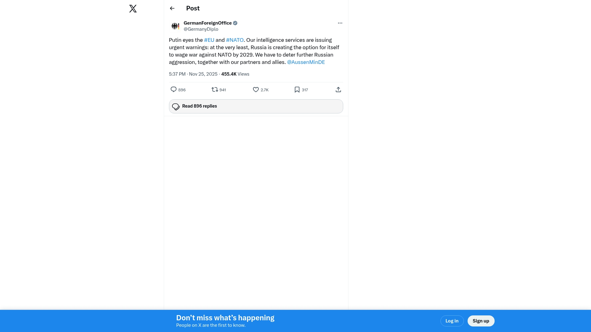 The German Foreign Office reports that Russian President Putin is focusing on the European Union (EU) and NATO. German intelligence services have issued urgent warnings that Russia is preparing, at minimum, the capability to wage war against NATO by 2029. The statement emphasizes the need to deter further Russian aggression in cooperation with partners and allies.