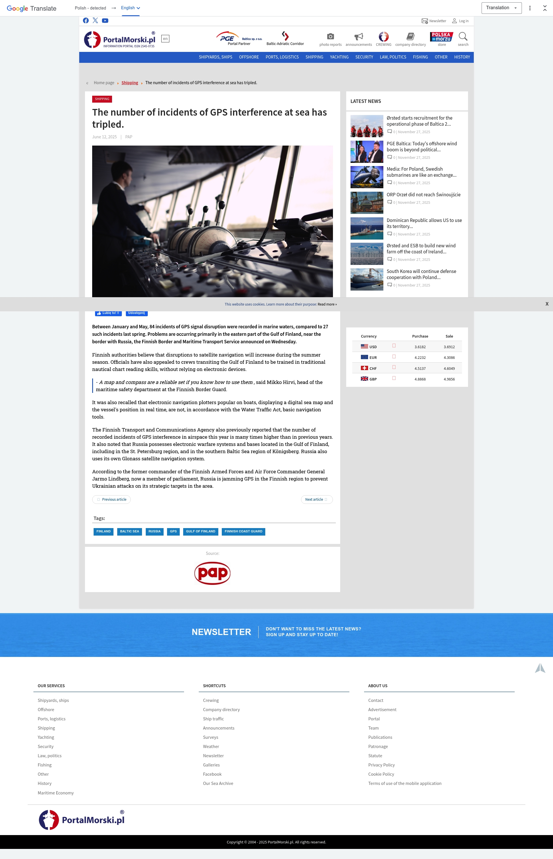 Between January and May 2025, 84 incidents of GPS signal disruption were recorded in marine waters, tripling compared to 27 incidents in the same period in 2024. These GPS interferences mainly occur in the eastern Gulf of Finland near the Russian border. Finnish authorities expect further disruptions during the summer and advise mariners in the area to rely on traditional navigation tools rather than electronic devices. The Finnish Transport and Communications Agency noted a similar rise in GPS interference incidents in airspace. It points to Russian electronic warfare capabilities and their use of jamming to prevent Ukrainian attacks, impacting navigation in the Gulf of Finland and southern Baltic Sea regions.