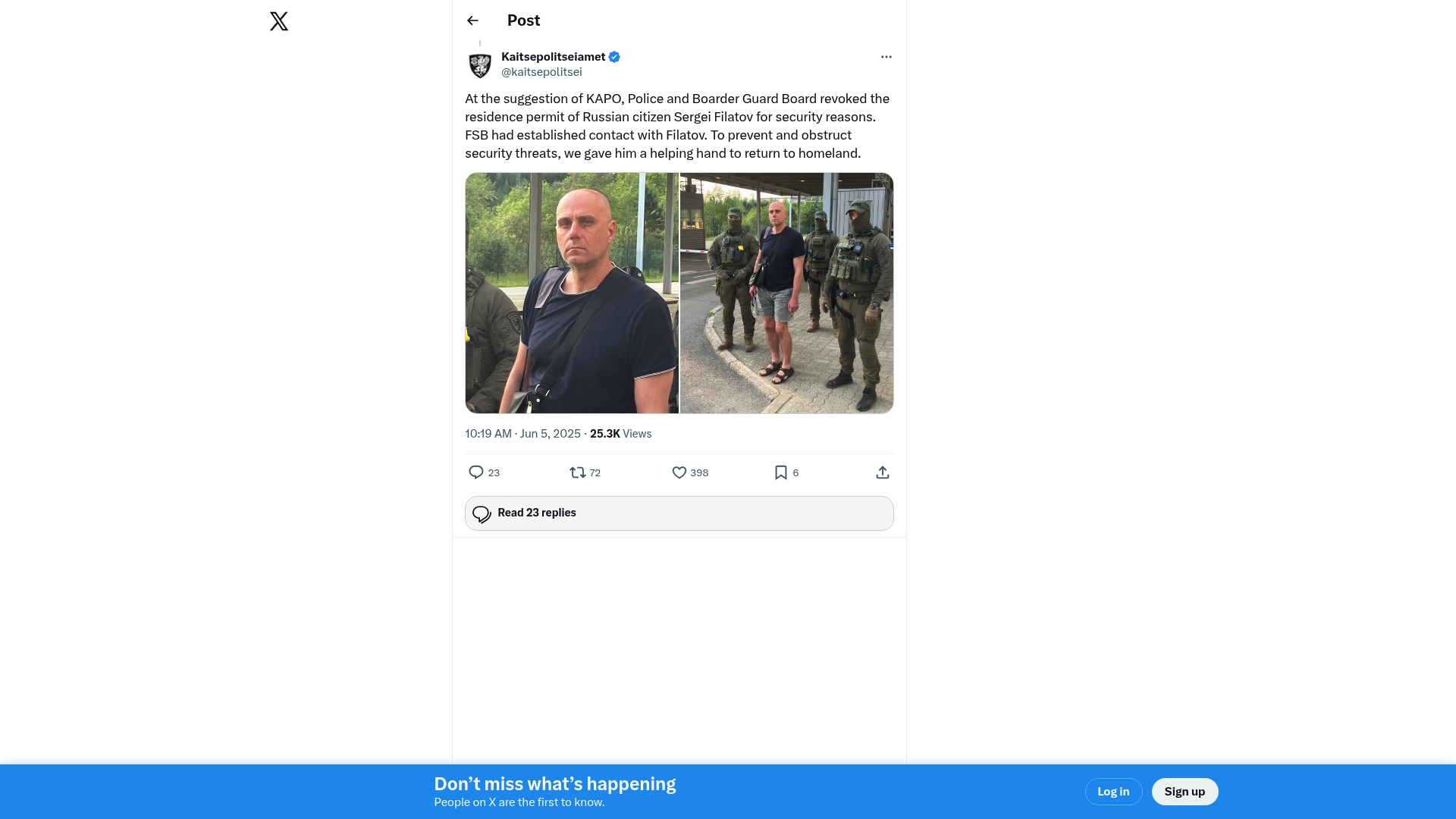 The Estonian Security Police (KAPO), Police and Border Guard Board revoked the residence permit of Russian citizen Sergei Filatov due to security reasons after FSB contact was established with him. To prevent and obstruct security threats, Estonian authorities facilitated his return to Russia.